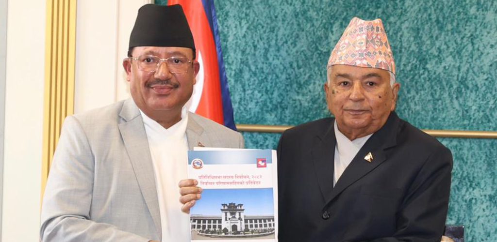- निर्वाचन आयोगका कार्यवाहक प्रमुख आयुक्त रामप्रसाद भण्डारीले राष्ट्रपति भवन शीतलनिवासमा प्रतिनिधिसभा निर्वाचनसम्बन्धी प्रतिवेदन पेस गर्नुभयो।