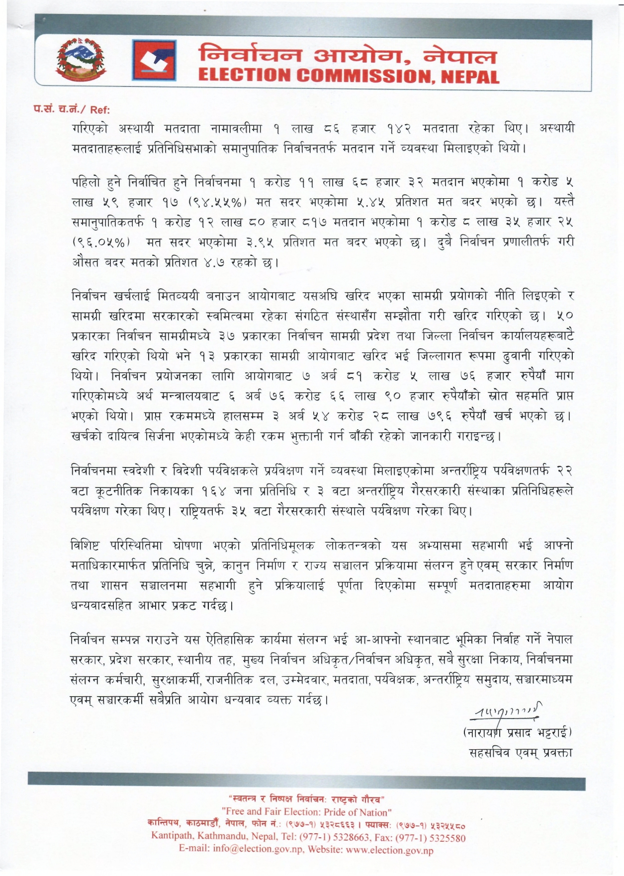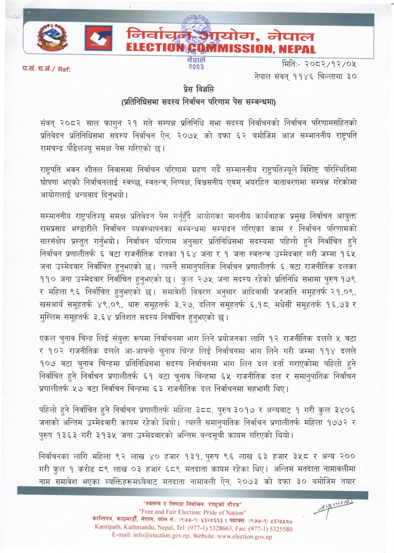 आयोगका प्रवक्ता नारायणप्रसाद भट्टराईले बिहीबार विज्ञप्ति जारी गरी २७५ जना सदस्य रहेको प्रतिनिधिसभामा १७९ पुरुष र ९६ जना महिला सांसद निर्वाचित भएको बताएका हुन् ।