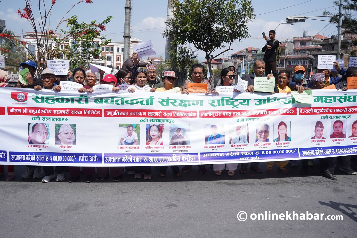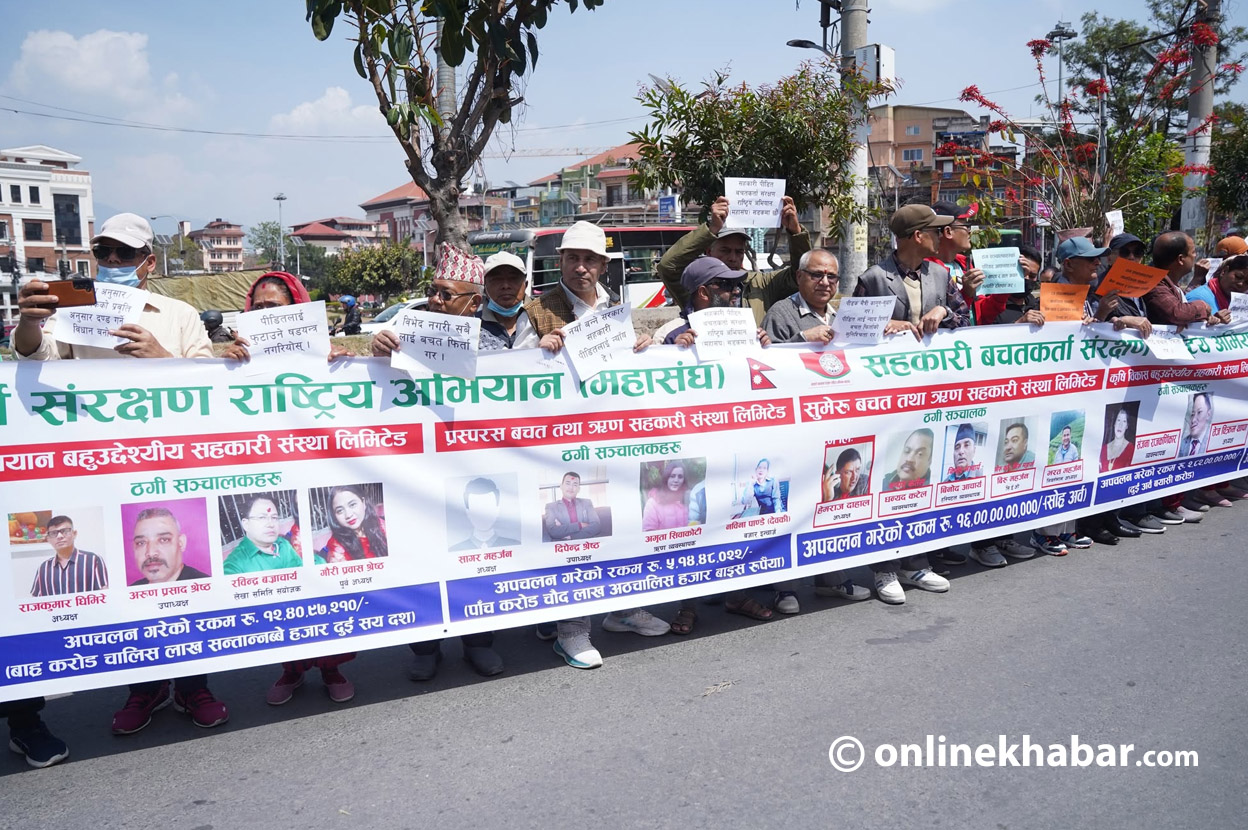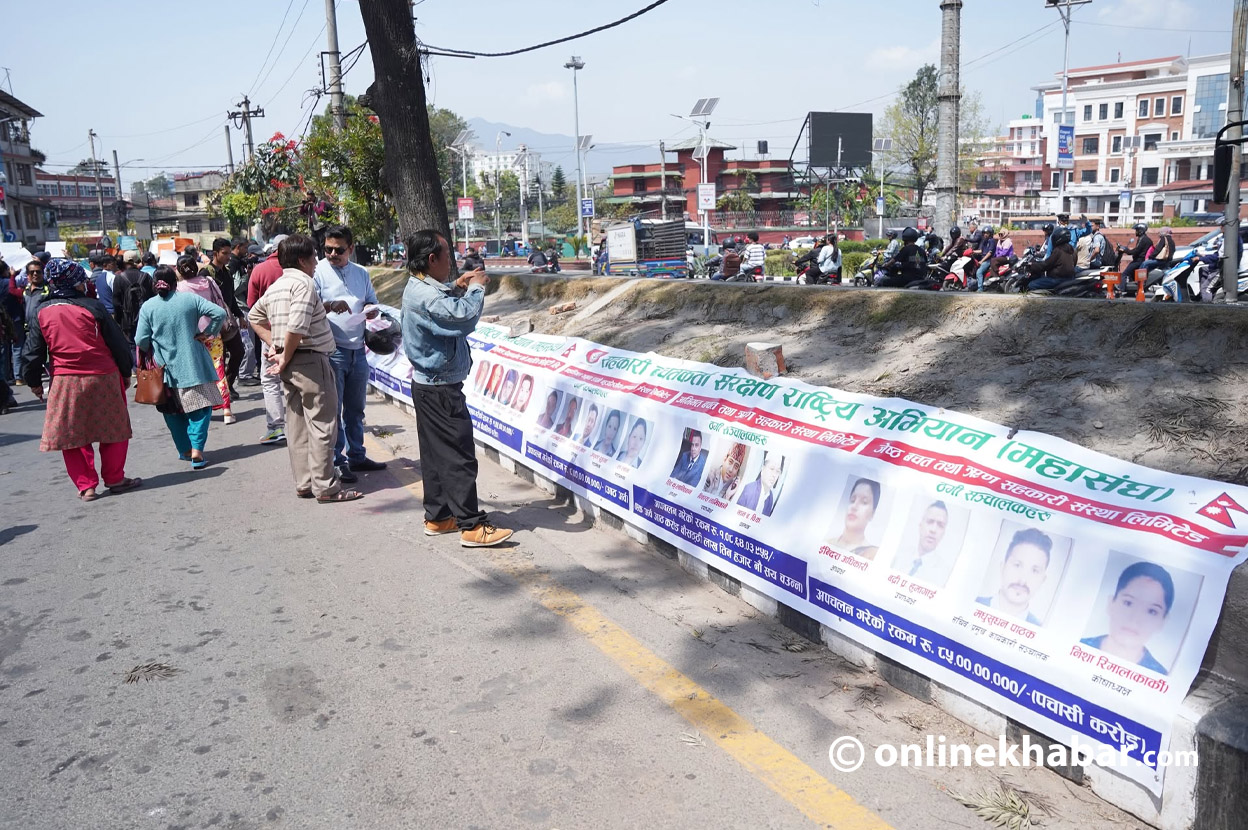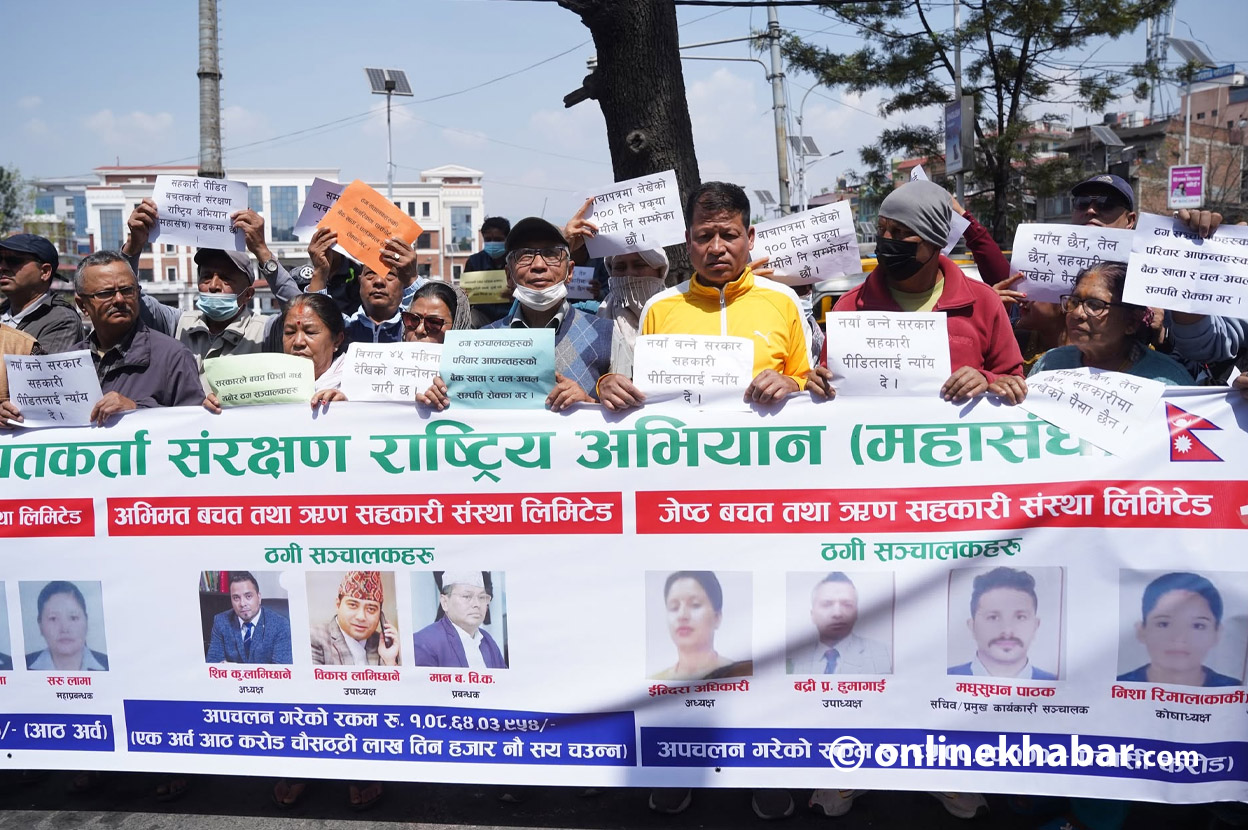 सहकारी बचतकर्ता संरक्षण राष्ट्रिय अभियान महासंघले शुक्रबार माइतीघरमा प्रदर्शन गरेका हुन् । उनीहरूले सहकारीका सञ्चालकहरूको तस्वीर समेत टाँसेर तयार पारिएको ब्यानर बोकेका छन् ।