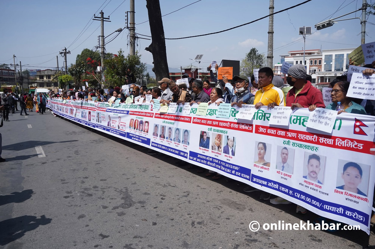 - प्रदर्शनमा सहभागीहरूले सहकारी सञ्चालकहरूको तस्वीर टाँसेर 'सबै बचत फिर्ता गर' लगायतका प्लेकार्डहरू बोकेको बताएका छन्।