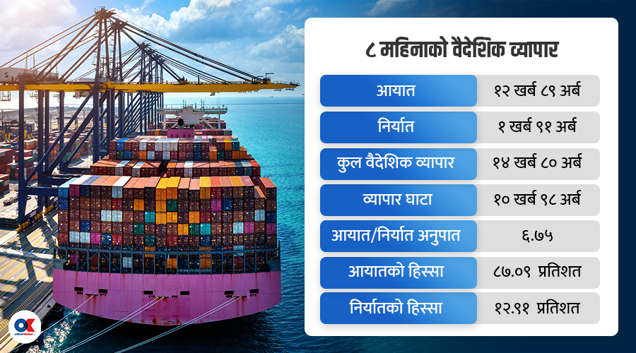 ८ महिनामा कुल वैदेशिक व्यापारको आकार १४ खर्ब ८० अर्ब ३६ करोड रुपैयाँ बराबरको भएको छ । जुन अघिल्लो आवको सोही अवधिको तुलनामा १३.५५ प्रतिशत धेरै हो । व्यापार घाटा १० खर्ब ९८ अर्ब रुपैयाँ बराबर छ । जुन अघिल्लो आवको तुलनामा ११.२२ प्रतिशत धेरै हो ।