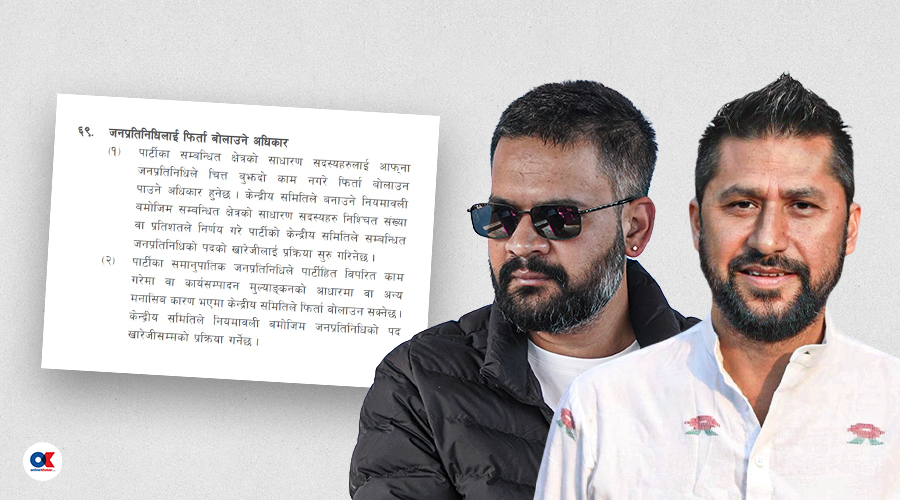 Generated by OK AI. Editorially reviewed.- राष्ट्रिय स्वतन्त्र पार्टीले विधानमा सांसद फिर्ता बोलाउने (राइट टू रिकल) व्यवस्था राखेको छ र नियमावली बनाउने प्रक्रियामा छ।