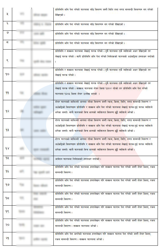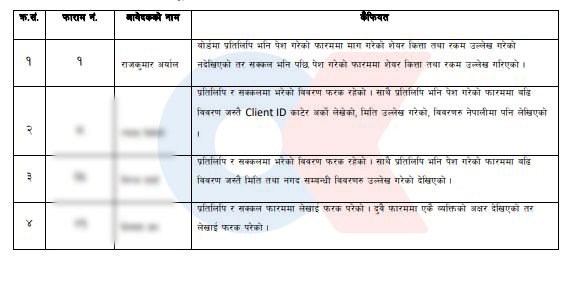 बोर्डको अध्ययन प्रतिवेदन अनुसार सीईओ अर्यालले आफ्नै सेयर माग आवेदनमा किर्ते गरेको देखिन्छ । अर्यालले बोर्डमा प्रतिलिपि भनी पेस गरेको फारममा माग गरेको सेयर कित्ता तथा रकम उल्लेख गरेको नदेखिएको तर सक्कल भनी पछि पेस गरेको फारममा सेयर कित्ता तथा रकम उल्लेख गरिएको प्रतिवेदनमा उल्लेख छ ।