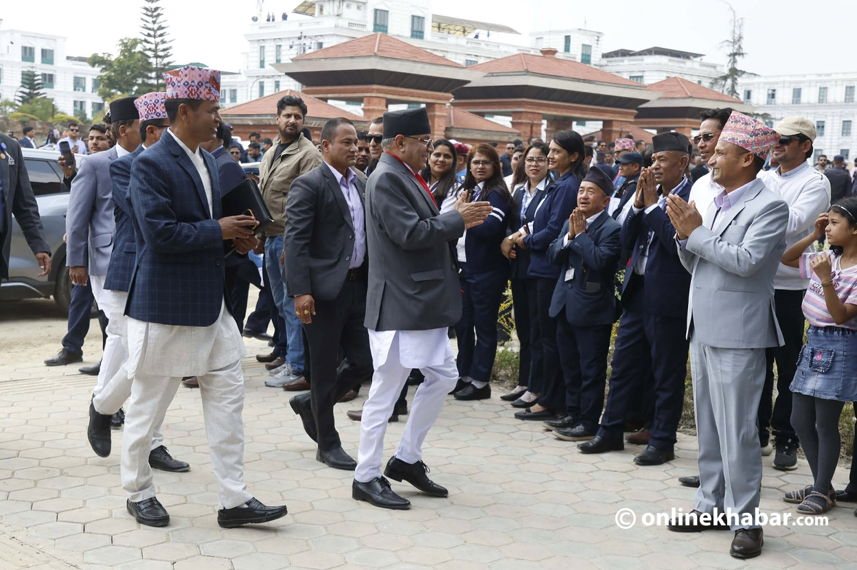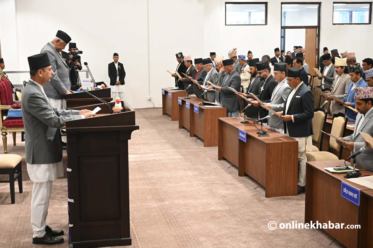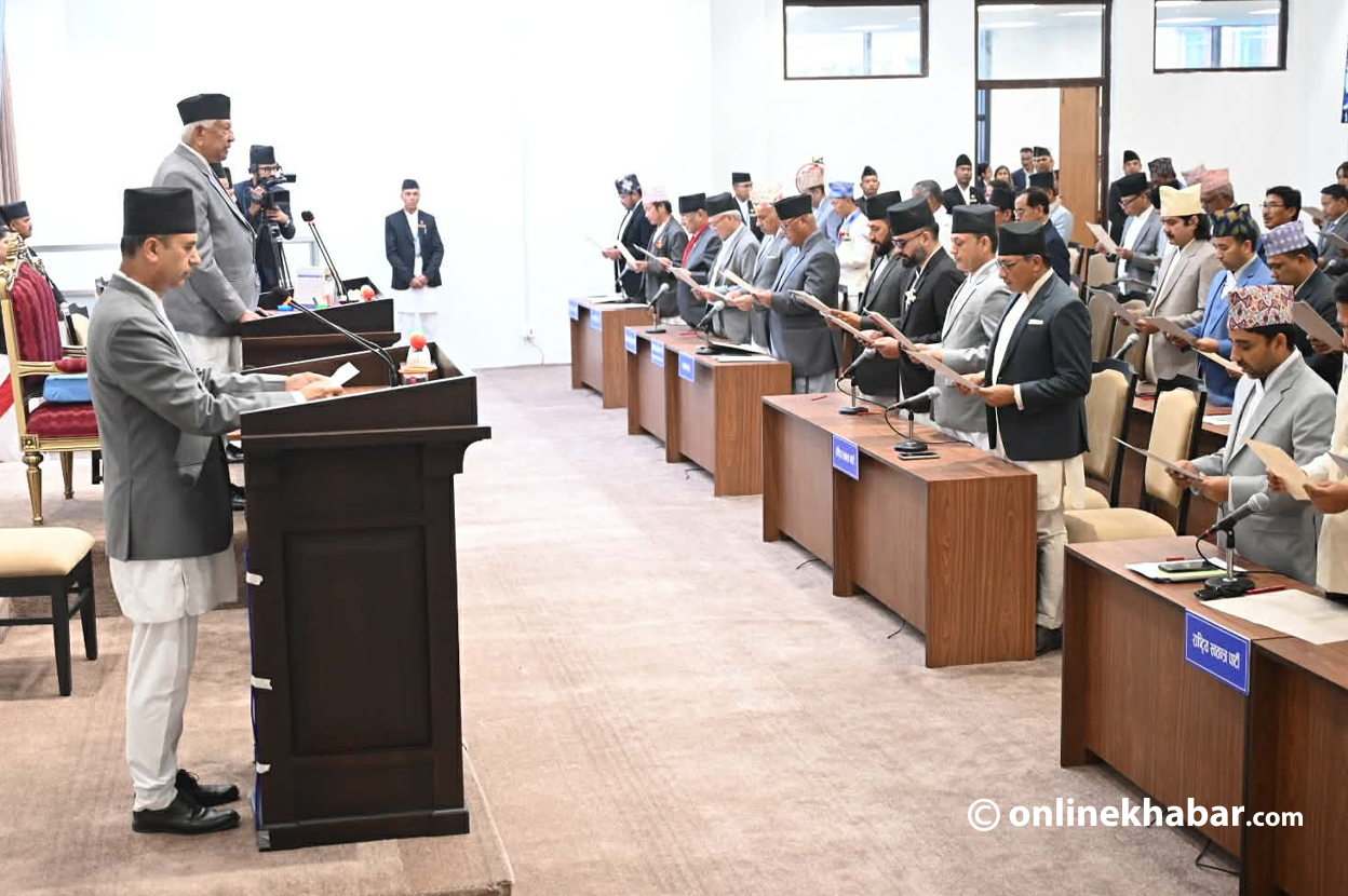 - प्रतिनिधिसभाका ज्येष्ठ सदस्य अर्जुननरसिंह केसीले सिंहदरबारस्थित संघीय संसद्को अस्थायी बहुउद्देश्यीय हलमा सांसदहरूलाई शपथ गराएका छन्।