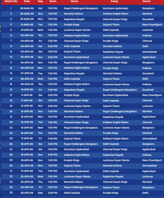 १२ चैत, काठमाडौं । भारतीय क्रिकेट कन्ट्रोल बोर्ड (बीसीसीआई) ले बिहीबार इन्डियन प्रिमियर लिग (आईपीएल) २०२६ को लिग चरणअन्तर्गत सबै खेलको तालिका सार्वजनिक गरिएको छ ।