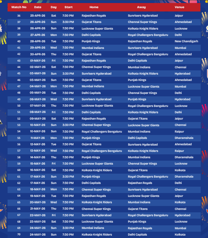 यसअघि प्रारम्भिक २० खेलको तालिका मात्र सार्वजनिक गरिएकोमा बीसीसीआईले लिगका बाँकी ५० खेलको तालिका पनि सार्वजनिक गरेको हो ।