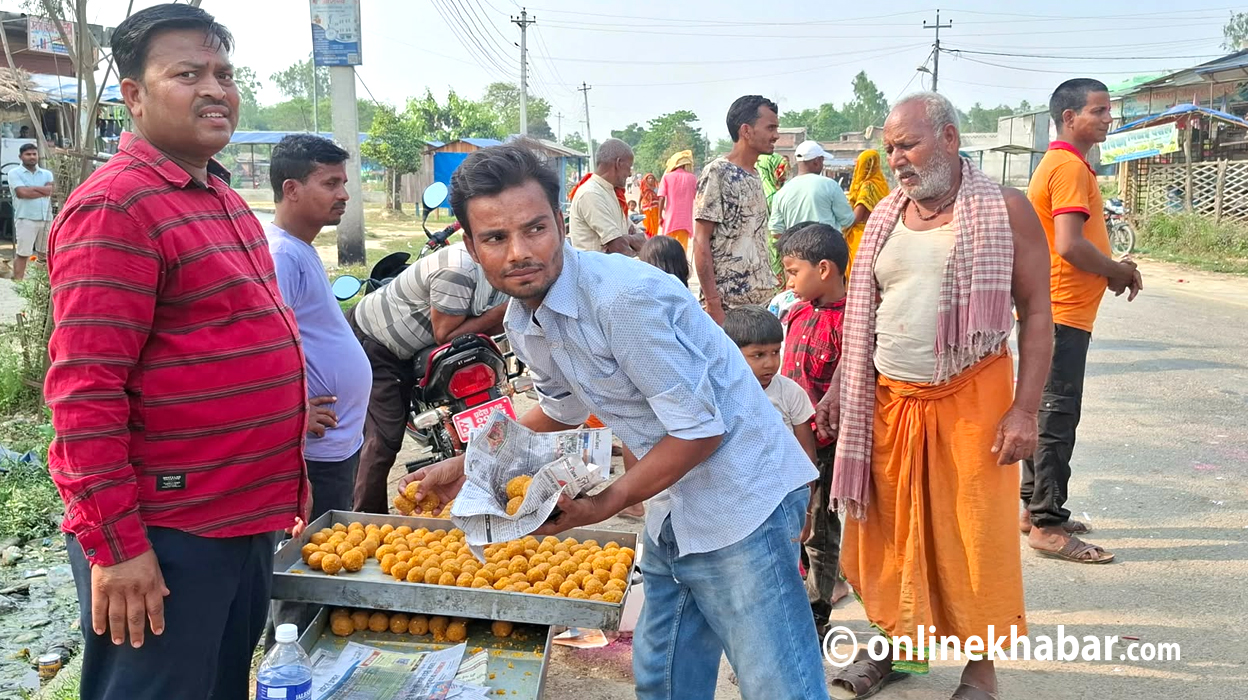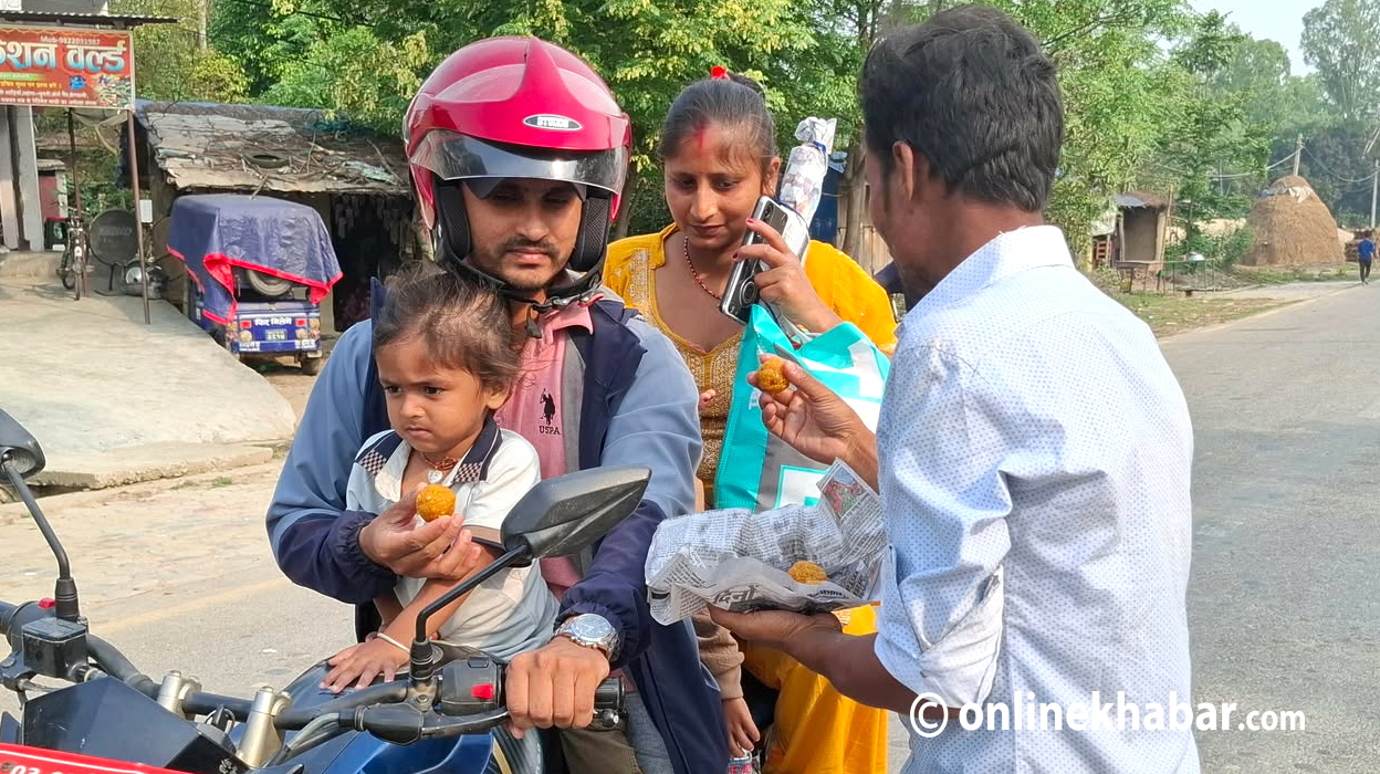 सडक भएर आवतजावत गर्ने पैदल यात्री, साइकल, मोटरसाइकल, बस, र्ट्याक्टर लगायत सवारीसाधन रोकेर सबै यात्रुलाई एक-एक वटा लड्डु (मुङ्गवा मिठाइ) वितरण गर्न गाउँलेहरू व्यस्त थिए ।