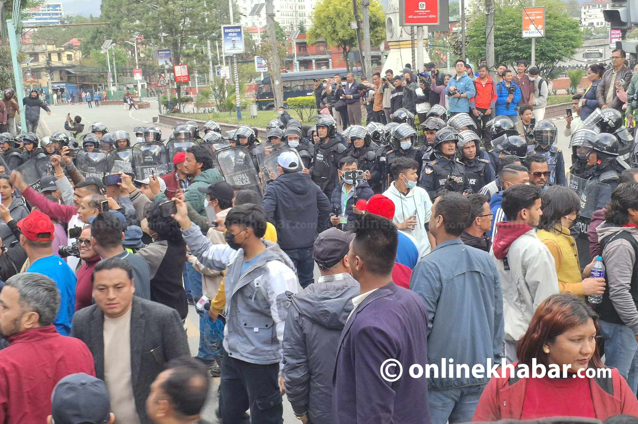 - प्रहरीले प्रदर्शनकारीहरूलाई रोक्दा पनि उनीहरू बबरमहलबाट नयाँ बानेश्वरतर्फ अघि बढेका थिए।
