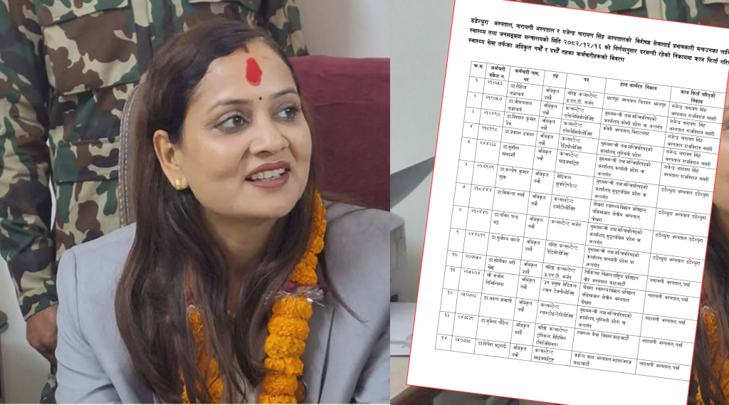 स्वास्थ्य तथा जनसंख्यामन्त्री निशा मेहताले देशभरि स्वास्थ्य सेवाको सन्तुलन मिलाउन तथा दुर्गम क्षेत्रमा विशेषज्ञ चिकित्सकको अभाव अन्त्य गर्न कडाइ गरेसँगै पहिलो चरणमा नवौँ र दशौँ तहका १४ जना विशेषज्ञ चिकित्सकलाई उनीहरूको दरबन्दी रहेको अस्पतालमा फिर्ता पठाइएकी छिन् ।