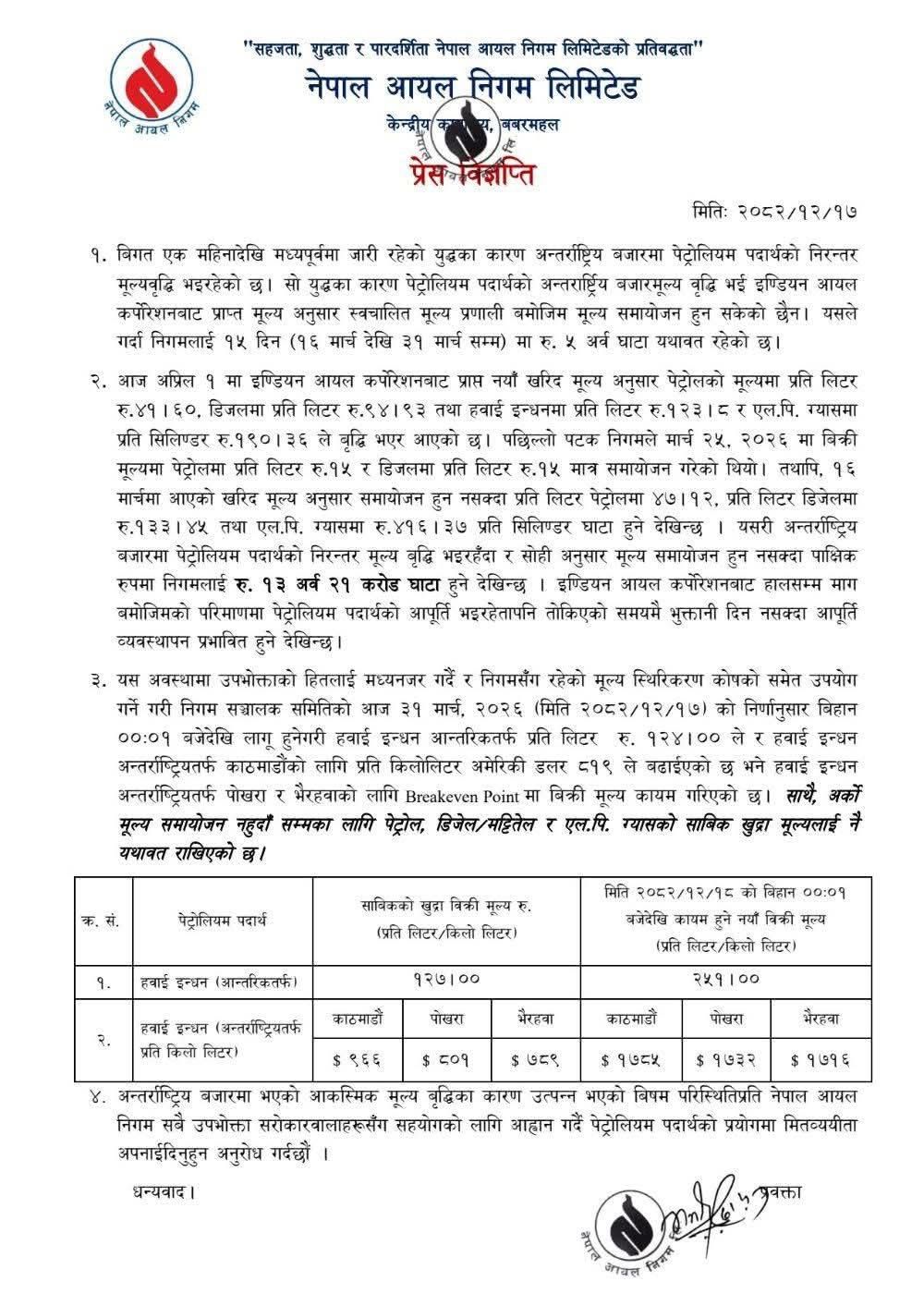 मंगलबार सार्वजनिक निगमको प्रेस विज्ञप्तिअनुसार हवाई इन्धनको मूल्य आन्तरिकतर्फ साविक १२७ प्रतिलिटर रहेकामा समायोजन गरेर २५१ रुपैयाँ प्रतिलिटर कायम गरिएको छ ।