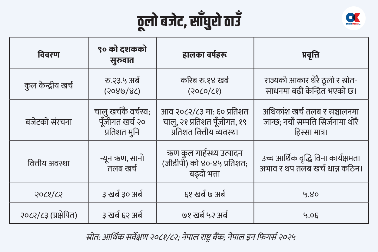 तथ्याङ्कले राज्यको आकार कति तीव्र गतिमा बढेको छ भन्ने स्पष्ट पार्छ। केन्द्र सरकारको कुल खर्च आर्थिक वर्ष २०४७/४८ मा रु.२३.५ अर्ब रहेकोमा आर्थिक वर्ष २०८०/८१ सम्म आइपुग्दा करिब रु.१४ खर्ब पुगेको छ। कुल बजेटको झन्डै दुईतिहाइ हिस्सा चालु खर्च (तलब, भत्ता, पेन्सन र सञ्चालन खर्च) ले ओगट्छ। अर्कोतर्फ; सडक, विद्यालय, अस्पताल, सिंचाइ र डिजिटल पूर्वाधार निर्माण गर्ने पूँजीगत खर्च भने बजेटको एक/पाँच भागभन्दा कममै सीमित छ र यो हरेक वर्ष पूर्णरूपमा खर्च हुन नसक्ने समस्याबाट ग्रसित छ।