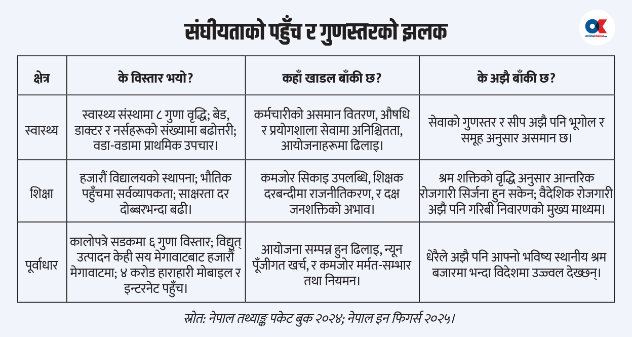 - संघीय संरचनाले स्वास्थ्य सेवा र विद्यालयहरूको संख्या वृद्धि गरेको छ तर गुणस्तर र सुशासनमा चुनौतीहरू अझै कायम छन्।