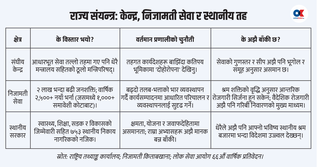 कागजी रूपमा, यो कथा प्रभावशाली छ। नेपालमा अहिले तीन तहको राज्य छ: एक संघीय सरकार, सात प्रदेश र ७५३ स्थानीय सरकारहरू। स्थानीय सरकारमा ६ महानगरपालिका, ११ उपमहानगरपालिका, २७६ नगरपालिका र ४६० गाउँपालिका छन्। स्थानीय निकायहरू सर्वसाधारण नागरिकको पहिलेभन्दा धेरै नजिक छन्, जसले आधारभूत स्वास्थ्य, शिक्षा, स्थानीय सडक, खानेपानी र स्थानीय आर्थिक विकासको जिम्मेवारी सम्हालेका छन्। सार्वजनिक क्षेत्रले केन्द्रीय ‘नियमित कर्मचारी सूचना प्रणाली’ (पीआईएस) मार्फत २ लाख भन्दा बढी निजामती कर्मचारीहरूको व्यवस्थापन गर्दछ र करिब ८ हजार ८०० सार्वजनिक स्वास्थ्य संस्थाहरू र १७ हजारभन्दा बढी आधारभूत विद्यालयहरूको रेखदेख गर्दछ। राज्य मानिसहरूको जीवनमा पहिलेभन्दा धेरै ठूलो र उपस्थित भएको छ।