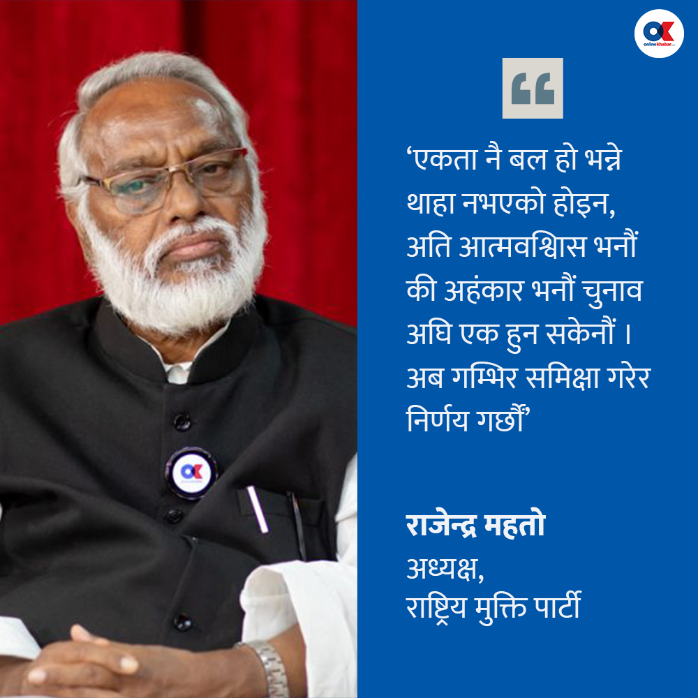 उनी भन्छन्, ‘एकता नै बल हो भन्ने हामीलाई थाहा नभएको होइन तर अति आत्मविश्वास भनौं की अहंकार भनौं चुनाव अघि एक हुन सकेनौं । अब गम्भीर समीक्षा गरेर निर्णय गर्छौं ।’