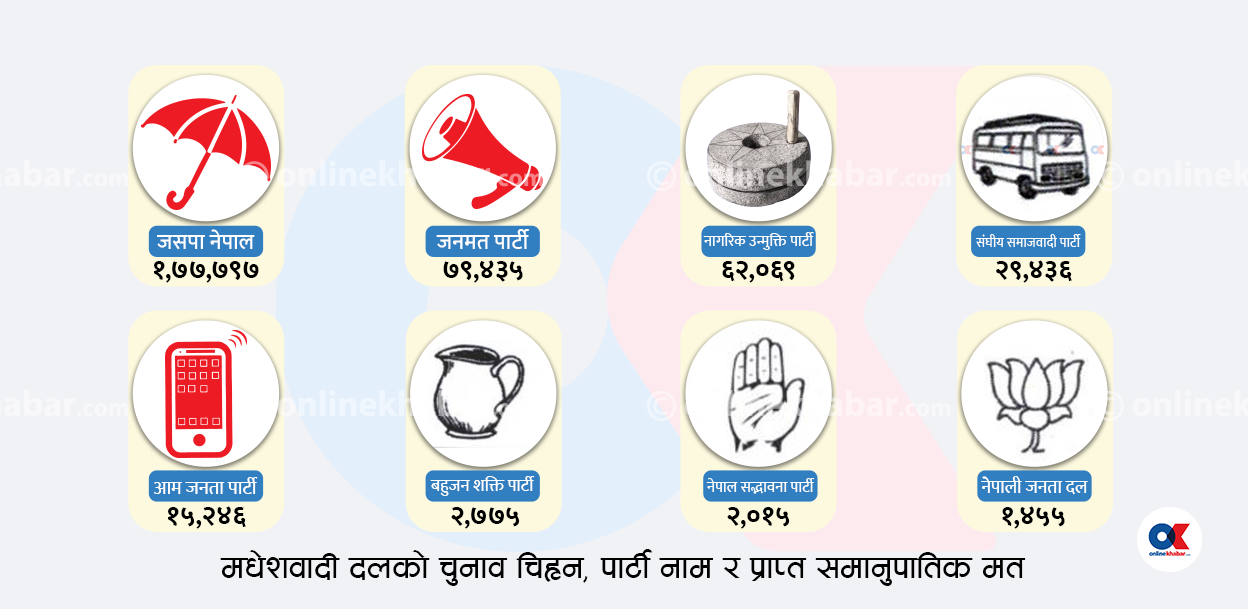गत फागुनको निर्वाचनमा मधेश प्रदेशका ३२ मध्ये ३० क्षेत्रमा राष्ट्रिय स्वतन्त्र पार्टी (रास्वपा)ले जित्यो । १३ लाख मत सहित रास्वपा मधेशमा पहिलो पार्टी बन्दा १ लाख ३८ हजार मत सहित जसपा नेपाल चौथो र ५० हजार मत पाएको जनमत पार्टी पाँचौं स्थानमा झर्यो ।