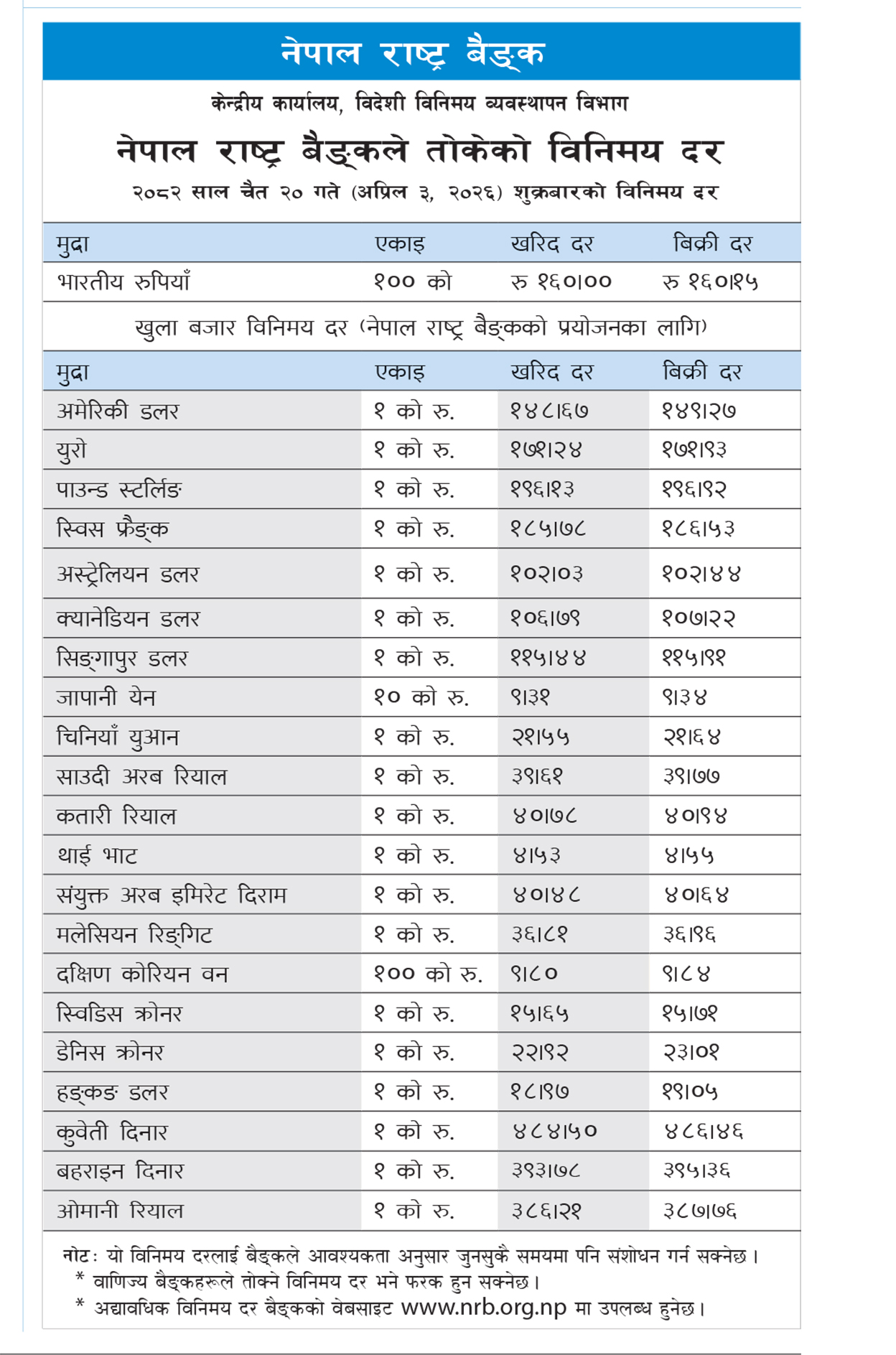 जापानी येन १० को खरिददर नौ रुपैयाँ ३१ पैसा र बिक्रीदर नौ रुपैयाँ ३४ पैसा, चिनियाँ युआन एकको खरिददर २१ रुपैयाँ ५५ पैसा र बिक्रीदर २१ रुपैयाँ ६४ पैसा, साउदी अरेबियन रियाल एकको खरिददर ३९ रुपैयाँ ६१ पैसा र बिक्रीदर ३९ रुपैयाँ ७७ पैसा, कतारी रियाल एकको खरिददर ४० रुपैयाँ ७८ पैसा र बिक्रीदर ४० रुपैयाँ ९४ पैसा कायम भएको छ ।