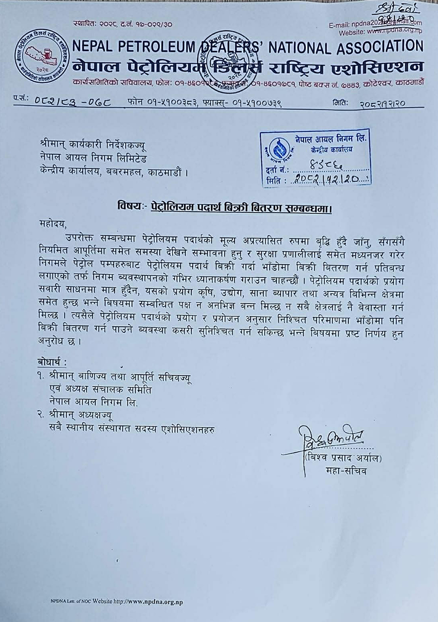 - एसोसिएसनका महासचिव विश्वप्रसाद अर्यालले वाणिज्य तथा आपूर्ति सचिव र नेपाल आयल निगमसँग यस्तो माग गरेको विज्ञप्तिमा उल्लेख छ।