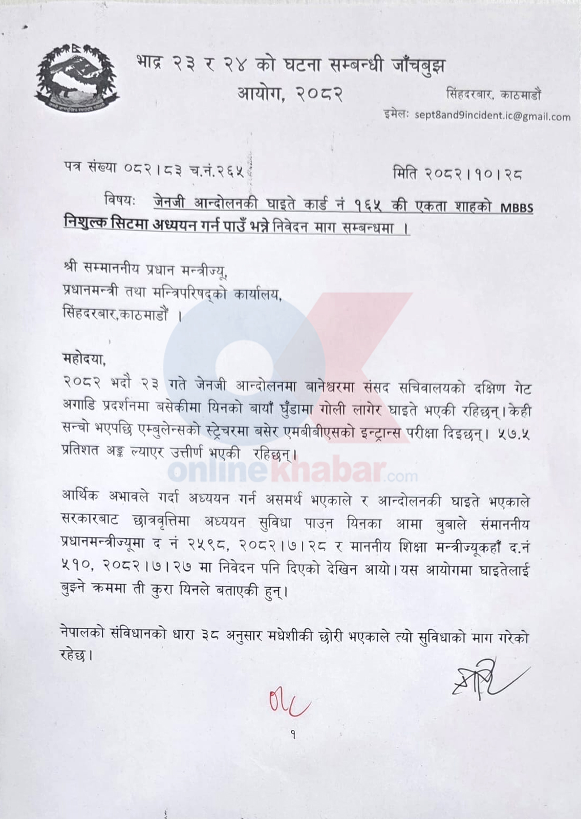 ‘गोलीले प्वाल पारेको कारणले अपांग भएकी एकतालाई हालको बसोबास घर नजिकको नेपाल मेडिकल कलेजमा अध्यापन सुरु भइसकेको भए तापनि प्रवेश गराएर अध्ययन गराइदिने प्रबन्ध सरकारले गर्नुपर्छ,’ पत्रमा भनिएको छ ।