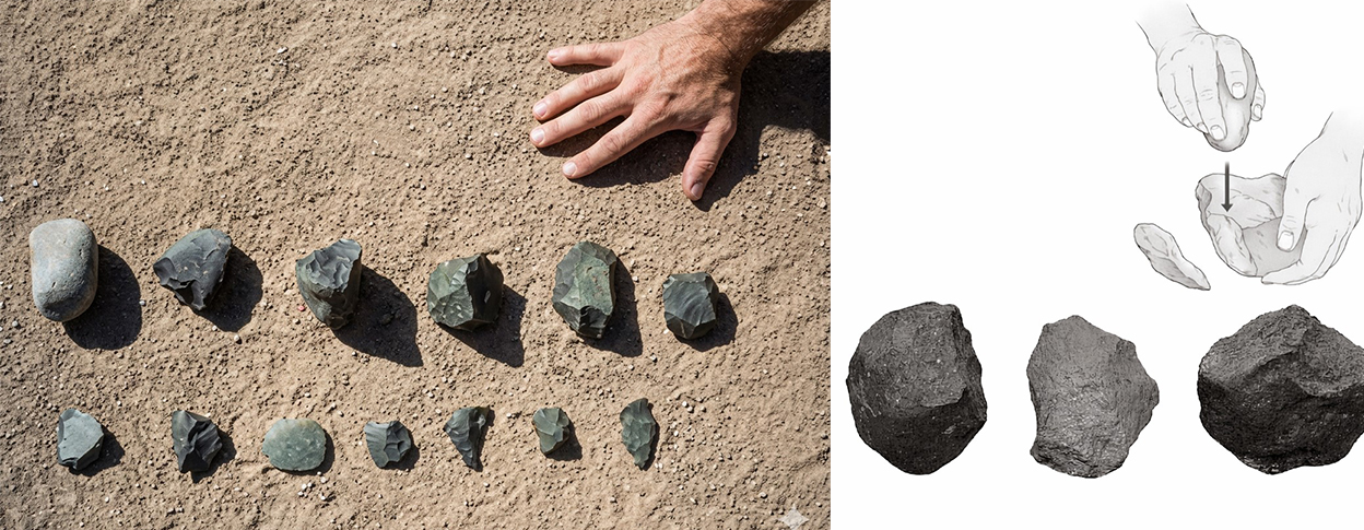 मानव पुर्खाहरूसँग जनावरको कडा छाला च्यात्न वा हड्डी फुटाउन सक्ने धारिलो दाँत वा नङ्ग्रा थिएनन्। मानवको दिमाग बाँदरको भन्दा केही उन्नत थियो। मरेको जनावरको मासु काट्न र हड्डीभित्रको प्रोटिनयुक्त मासी निकाल्न प्राकृतिक रूपमा पाइने ढुङ्गा चलाउन सिके। त्यसले अलि सहज भयो। त्यसपछि उनीहरूको मस्तिष्क ढुङ्गे औजार बनाउनेतर्फ गयो ।
