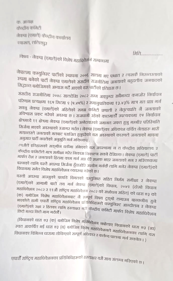 स्रोतका अनुसार, निर्वाचन सम्पन्न भएको एक महिनासम्म पनि औपचारिक समीक्षा पार्टीभित्र शुरू नभएकाले विशेष महाधिवेशन माग गर्न प्रतिनिधिहरूको हस्ताक्षर अभियान शुरू गरिएको छ ।