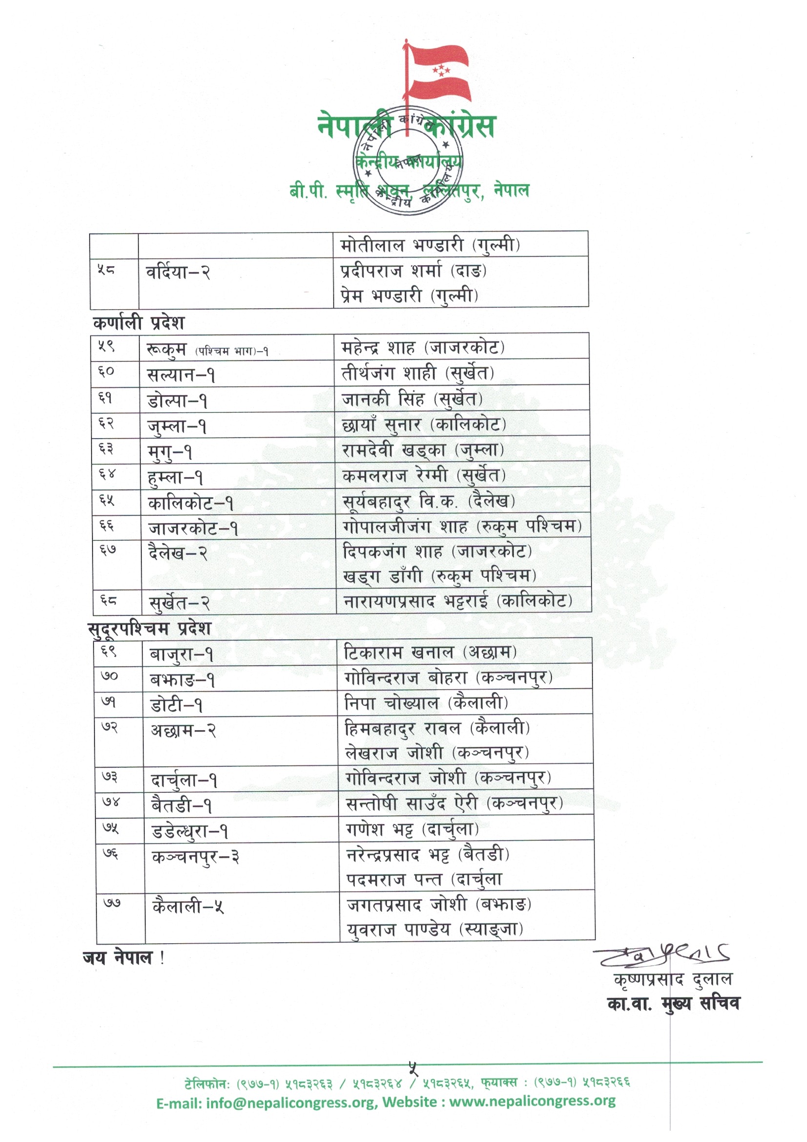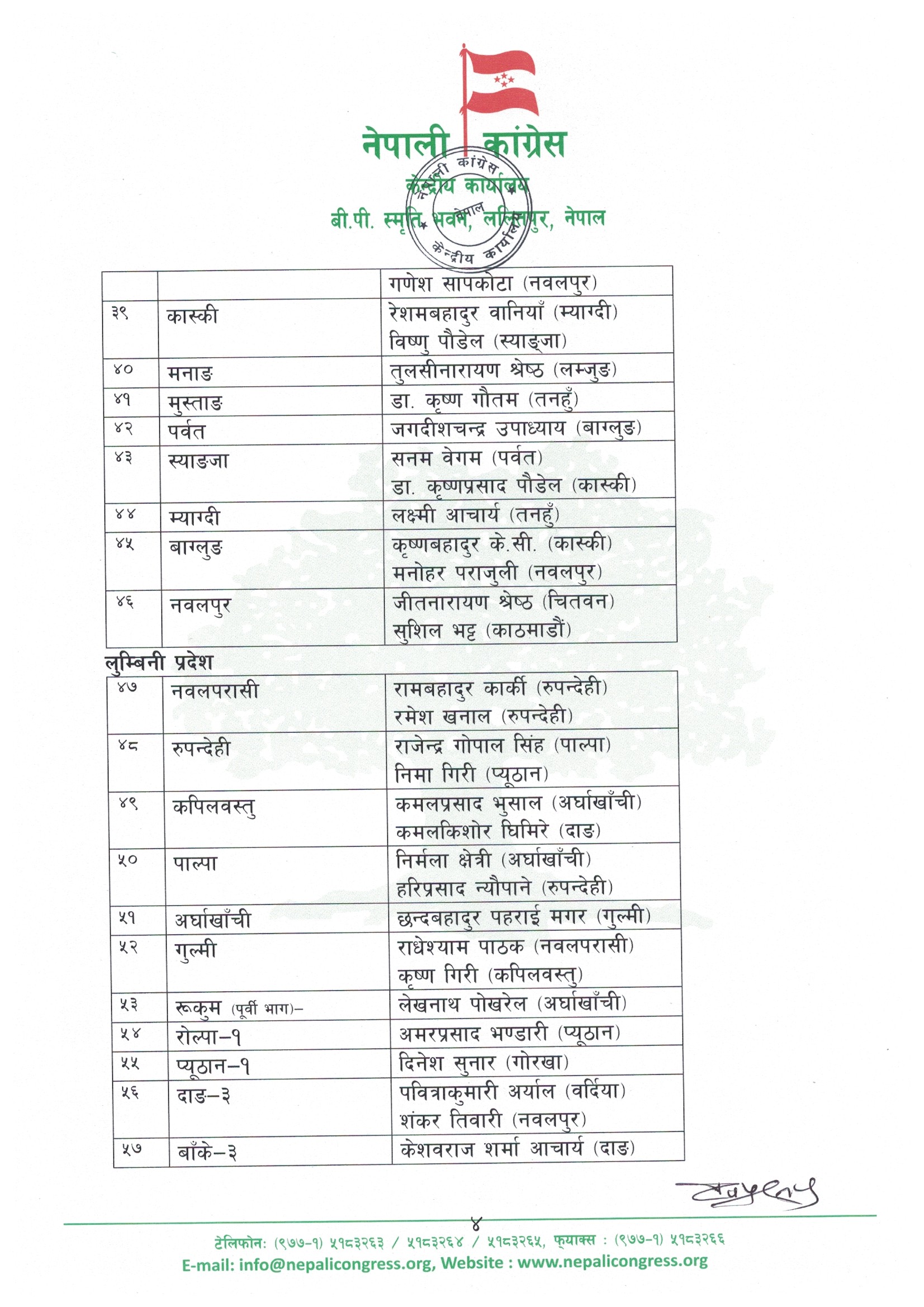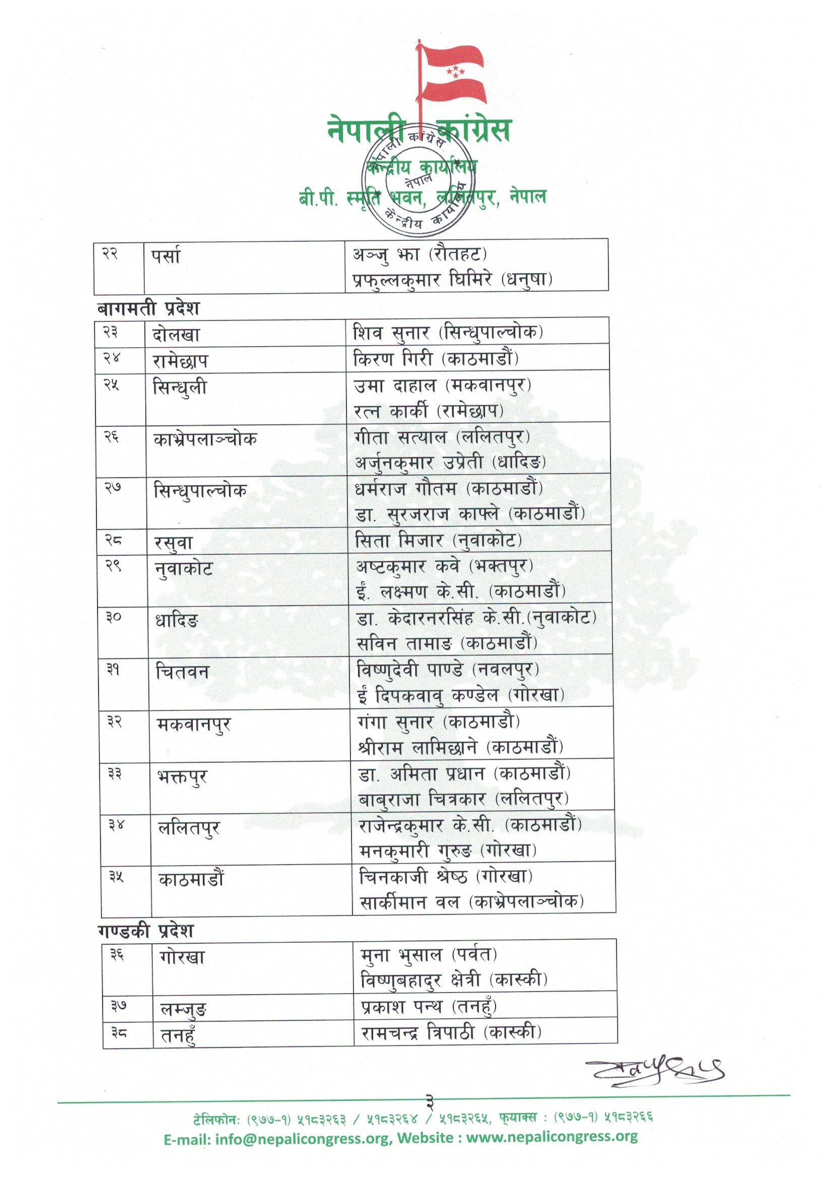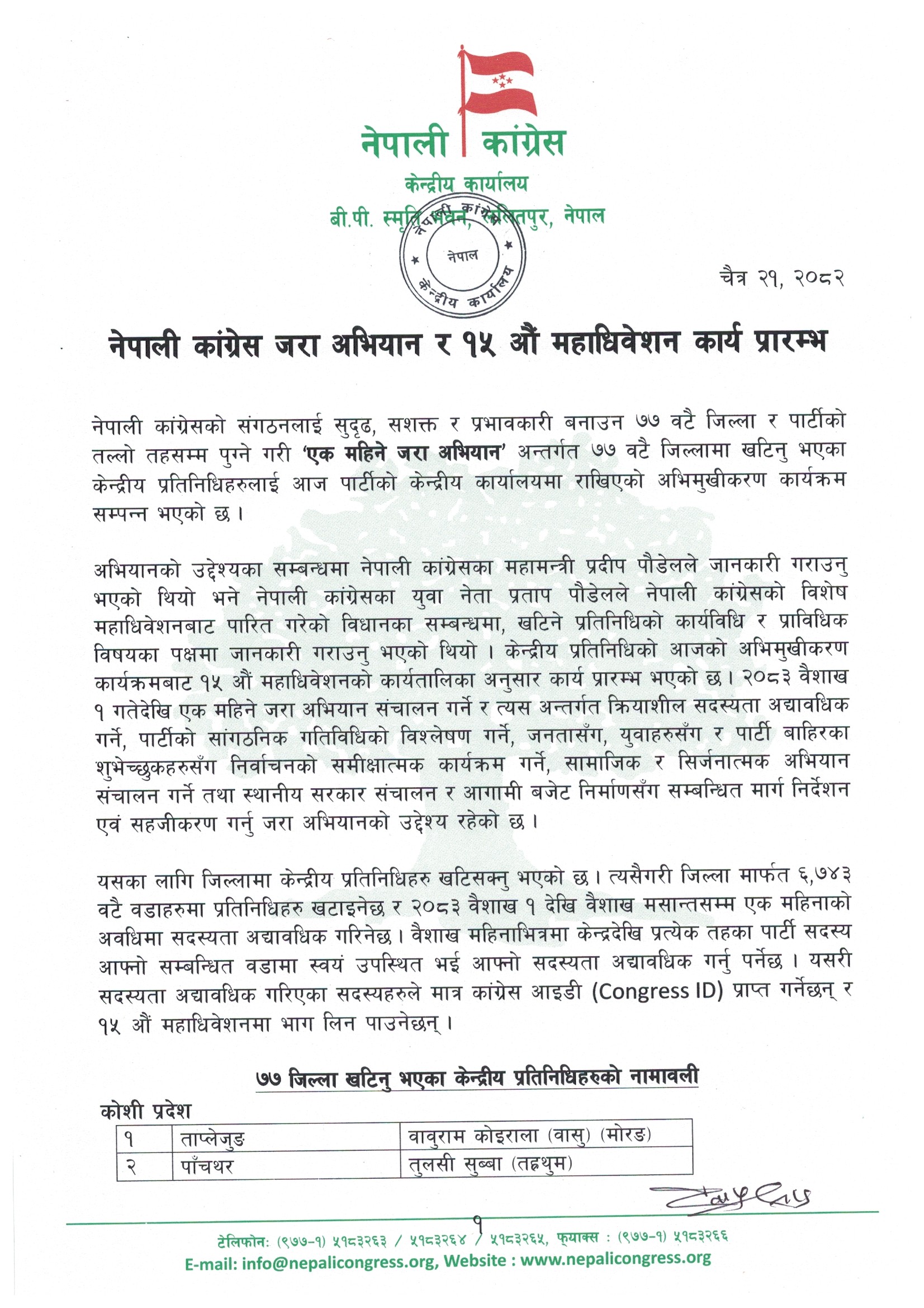 २१ चैत, काठमाडौंं । नेपाली कांग्रेसले १५ औं महाधिवेशनको प्रक्रिया अगाडि बढाउन ७७ वटै जिल्लाहरूमा खटिने केन्द्रीय प्रतिनिधिरूको नामावली सार्वजनिक गरेको छ ।