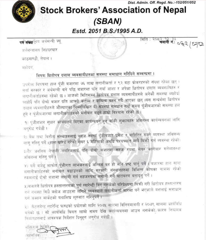 • सेयर बजारमा लगानीकर्ताको मनोबल कमजोर भएपछि स्टक ब्रोकर एसोसिएसन अफ नेपालले अर्थमन्त्री स्वर्णिम वाग्लेसँग ६ बुँदे सुझाव दिएको छ।