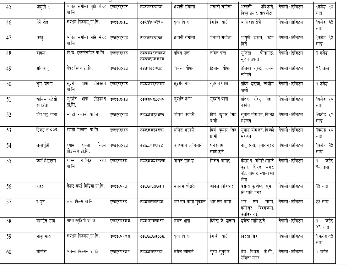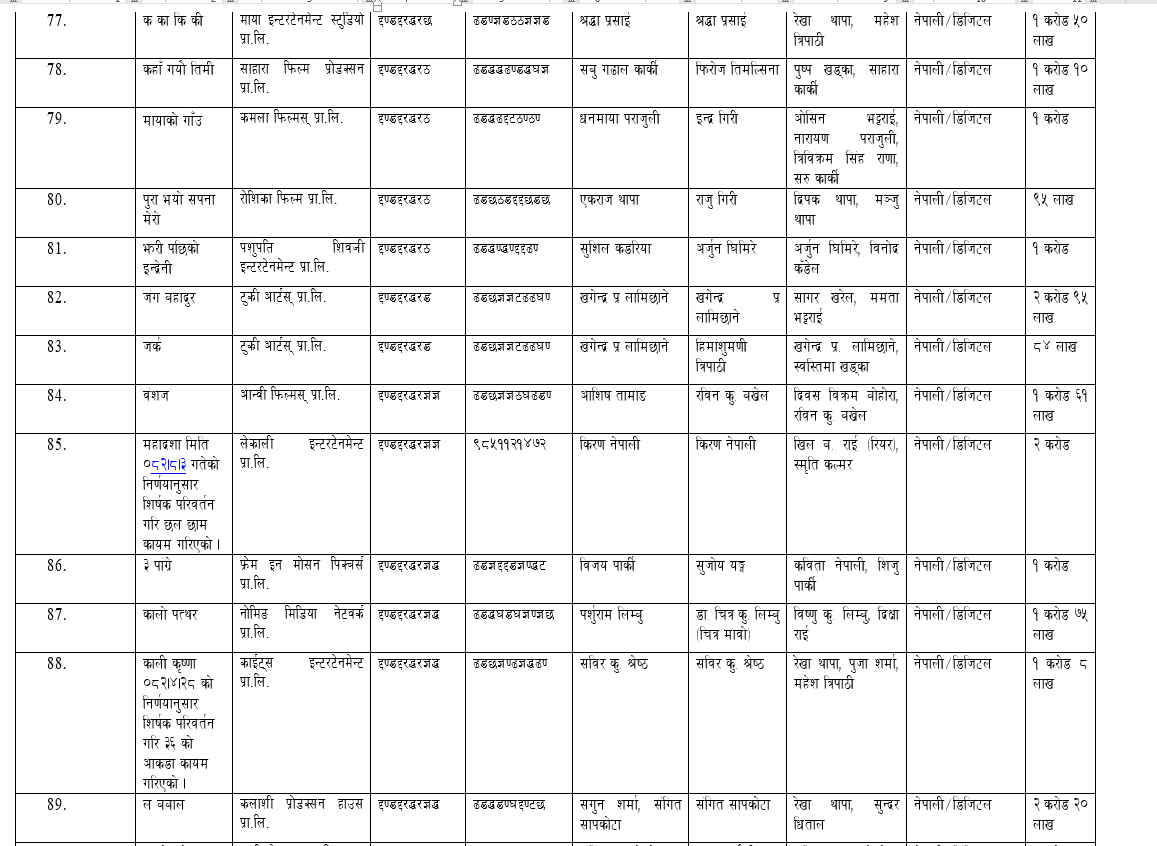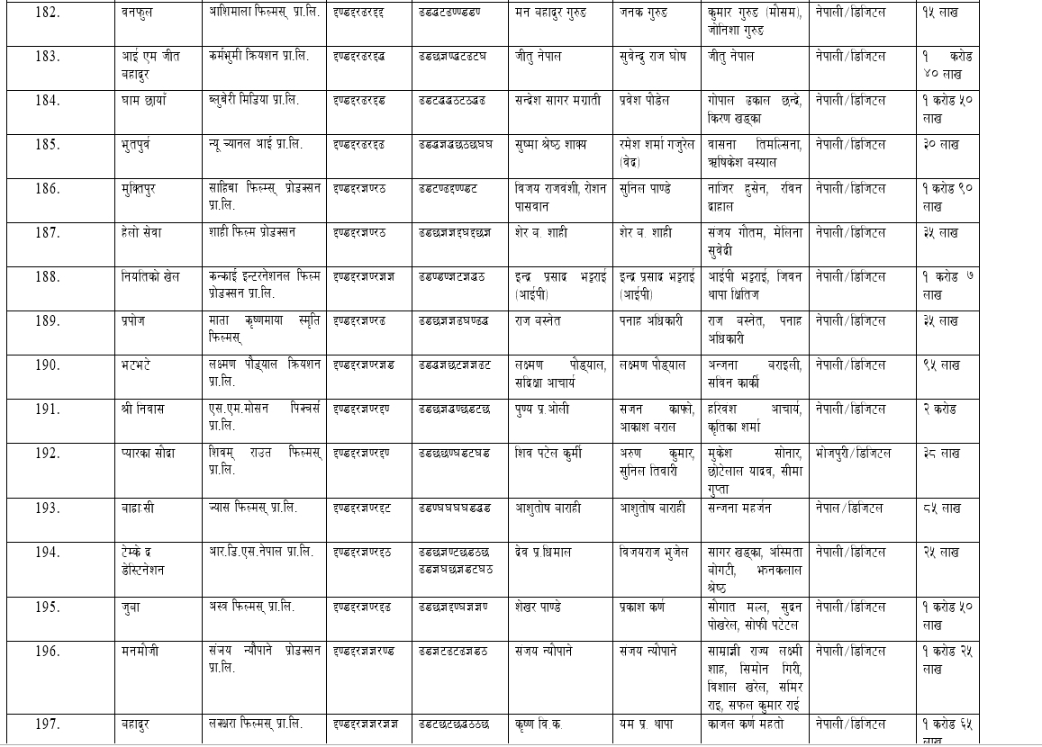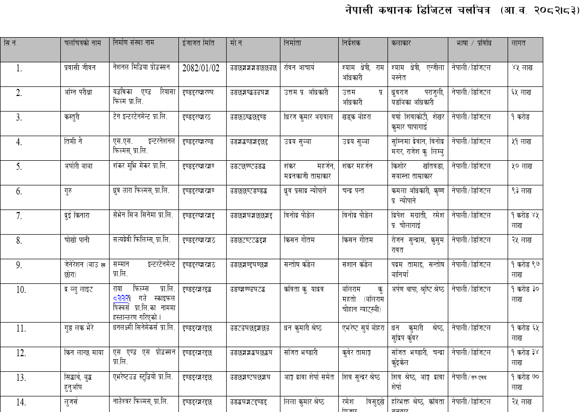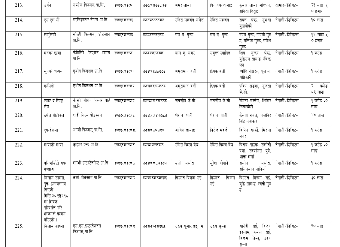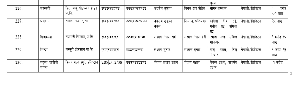 Generated by OK AI. Editorially reviewed.- चलचित्र विकास बोर्डले २०८२ सालमा कुल २३० वटा नेपाली फिल्मले निर्माण इजाजत पाएको सूची सार्वजनिक गरेको छ।