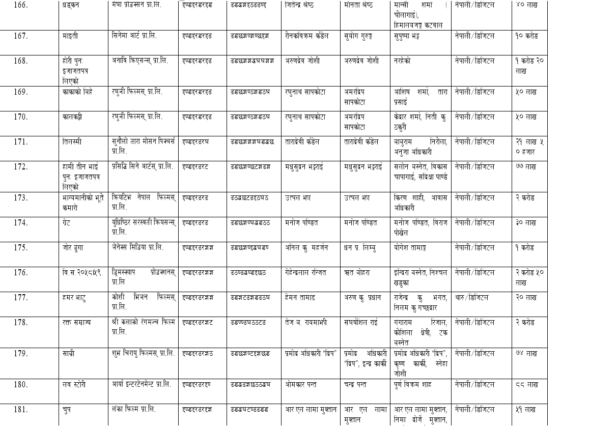 काठमाडौं । २०८२ सालमा कुल २३० वटा नेपाली फिल्मले निर्माण इजाजत पाएका छन् । चलचित्र विकास बोर्डले बैशाखदेखि चैतसम्म निर्माण अनुमति पाउने फिल्मको सूची सार्वजनिक गरेको छ ।