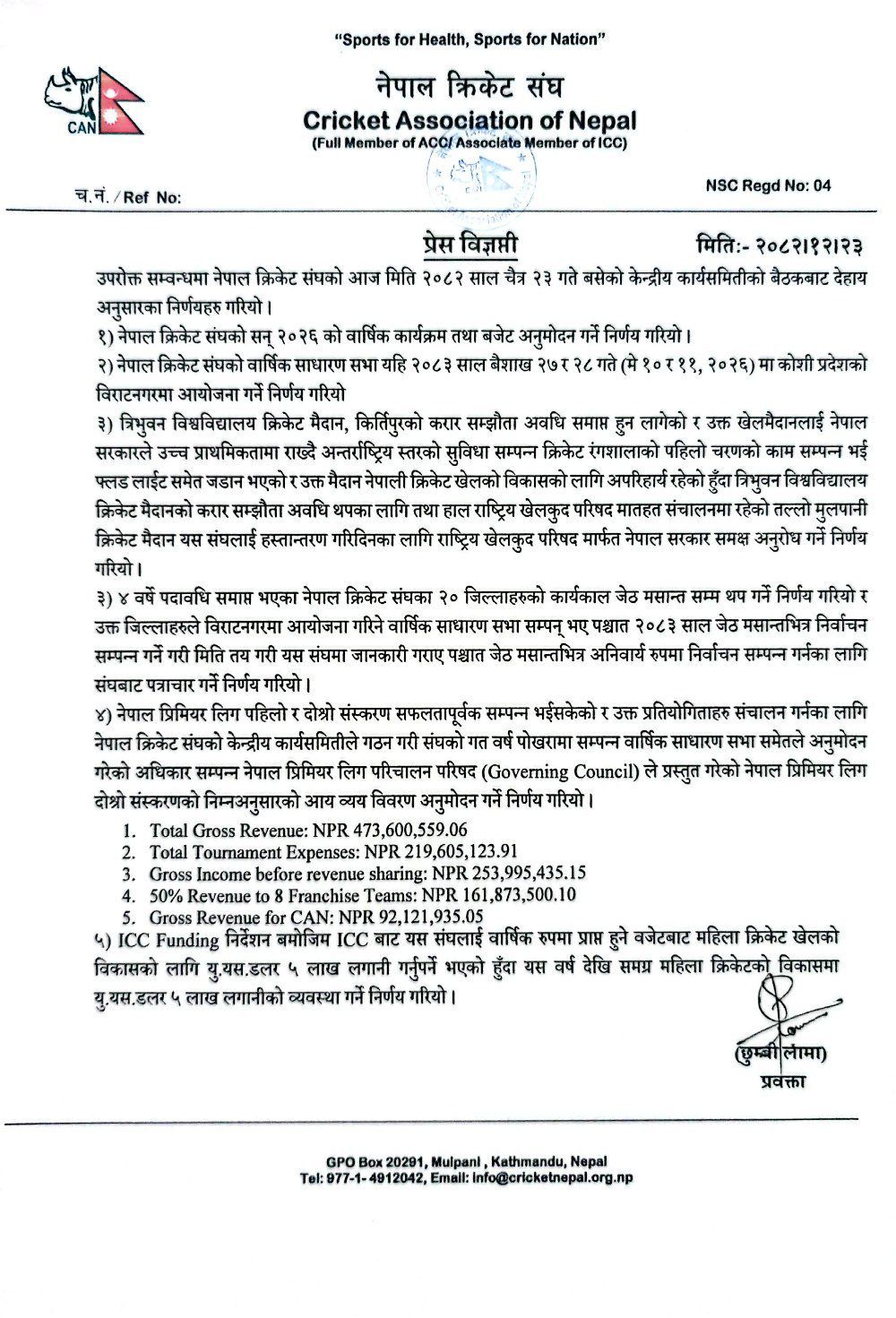 एनपीएल २०२५ को आय-व्यय अनुमोदन, यस्ता छन् क्यान बोर्ड बैठकका निर्णय