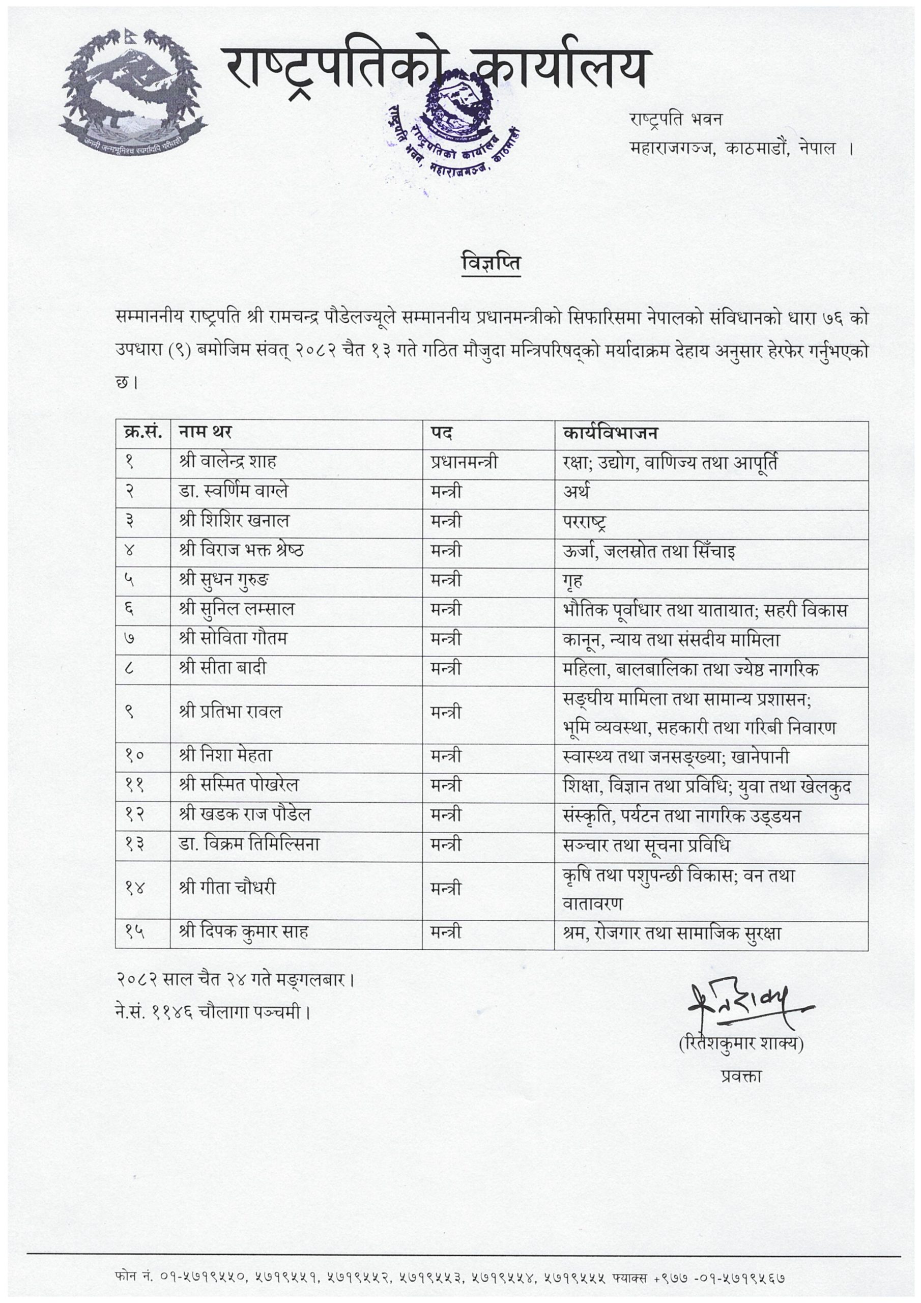 त्यसपछि सञ्चार तथा सूचना प्रविधिमन्त्री डा. विक्रम तिमिल्सिना, कृषि तथा पशुपन्छी विकास; वन तथा वातावरणमन्त्री गीता चौधरी छन् ।