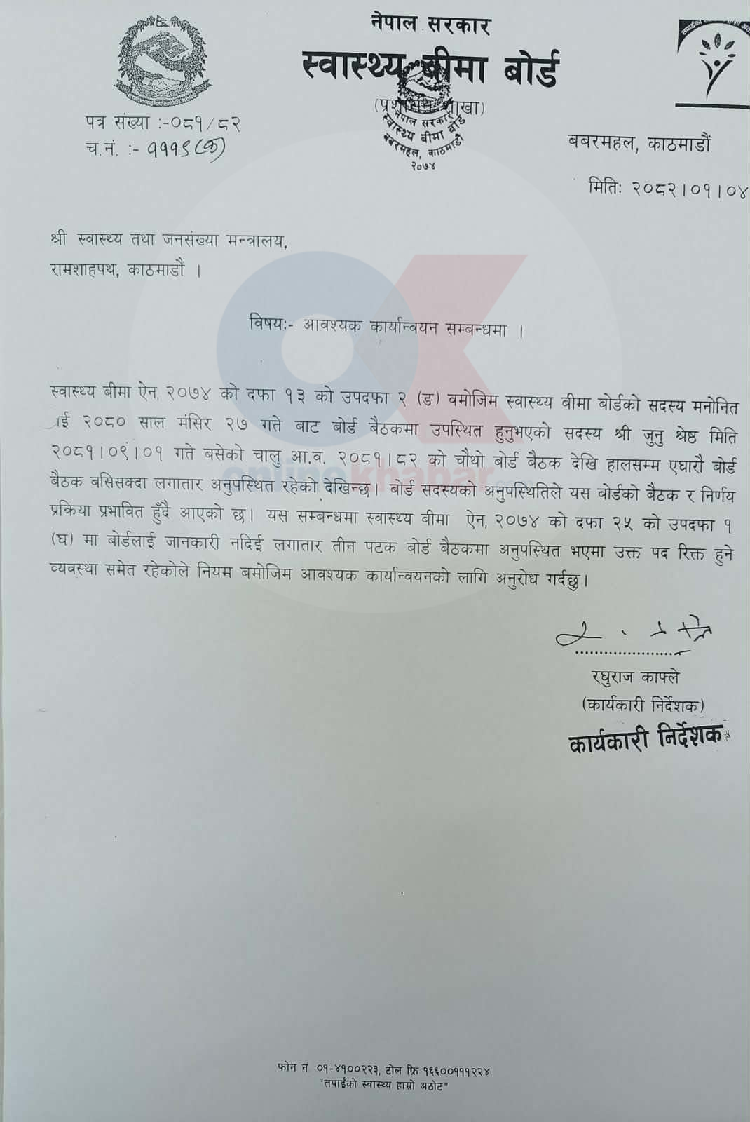 जानकारी नदिई तीन पटक बोर्ड बैठकमा अनुपस्थित भएमा उक्त पद रिक्त हुने व्यवस्था रहेको भन्दै नियम बमोजिम आवश्यक कार्यान्वयनलाई तत्कालीन बोर्डका निर्देशक डा. रघुराज काफ्ले स्वास्थ्य मन्त्रालयलाई पत्र काटेका थिए ।