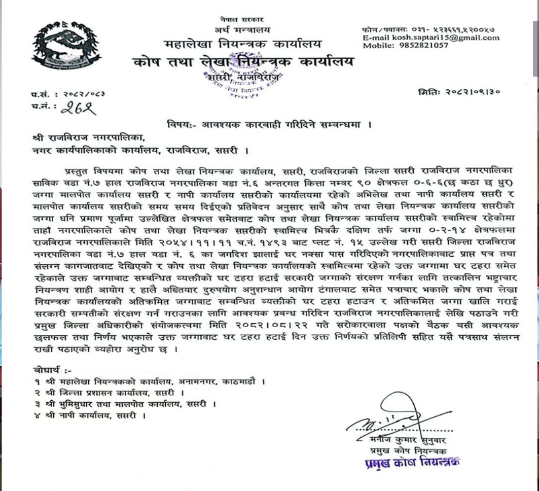 कोलेनिकाद्वारा जग्गा मिचेर बनाएको संरचना  हटाउन राजबिराज नगरपालिकालाई पत्राचार