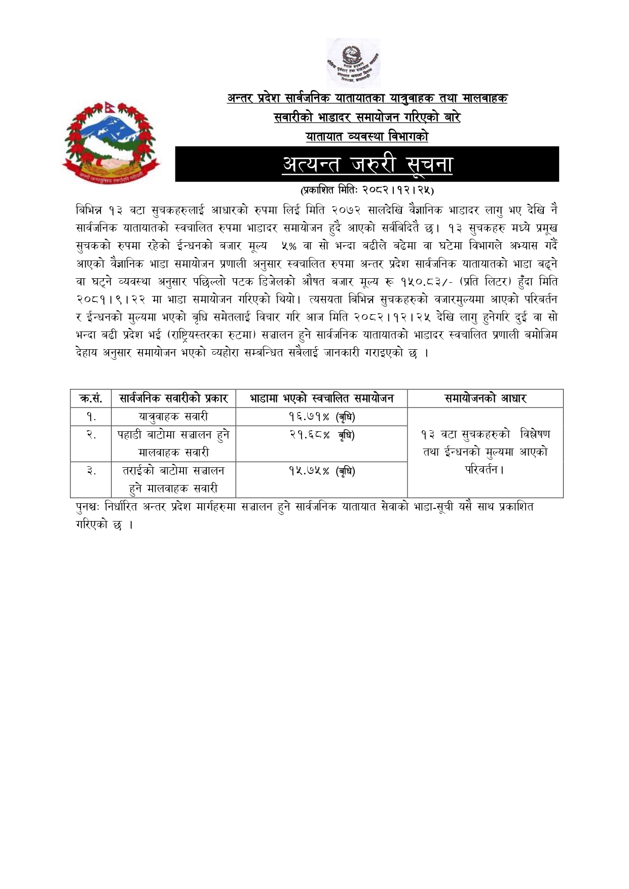Generated by OK AI. Editorially reviewed.- सरकारले सार्वजनिक यातायातको भाडा १६.७१ प्रतिशतले वृद्धि गरेको छ।