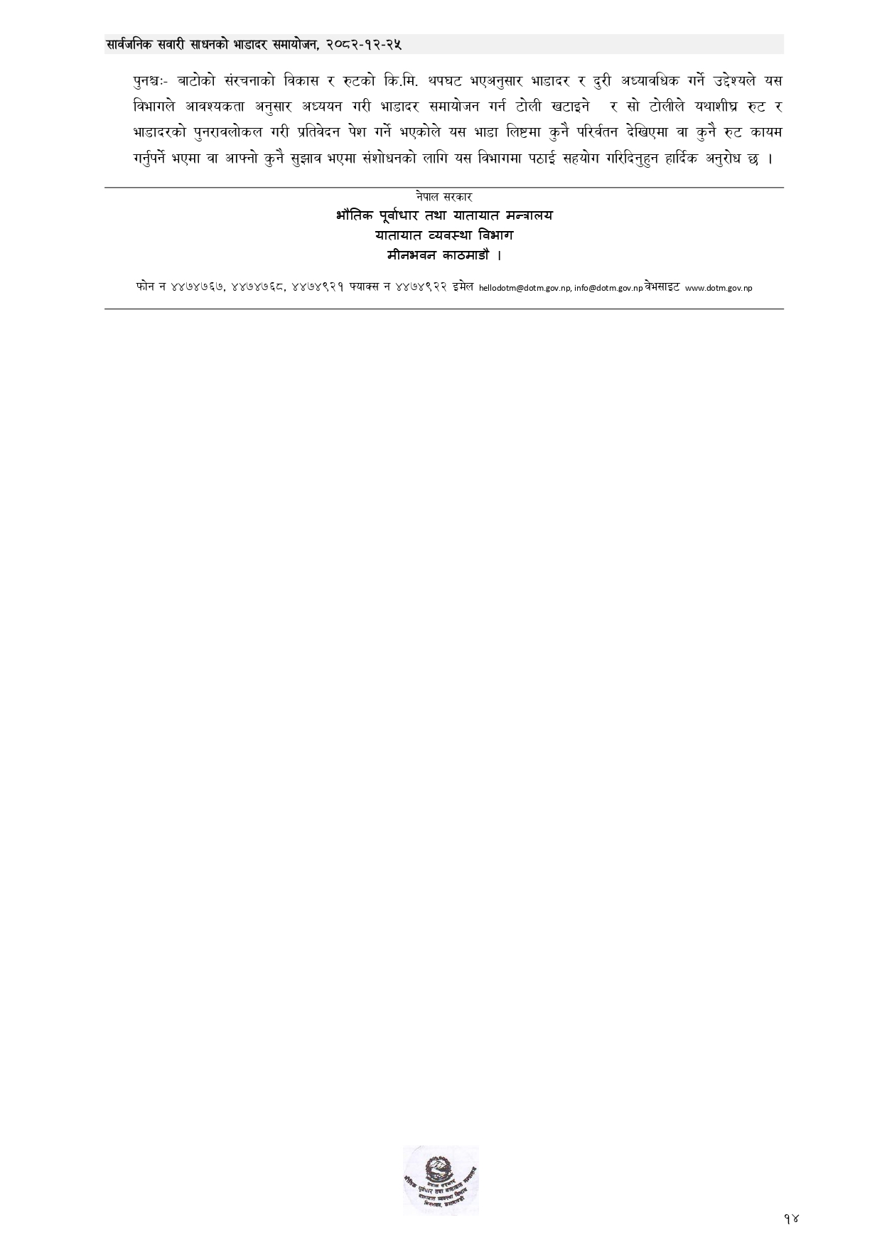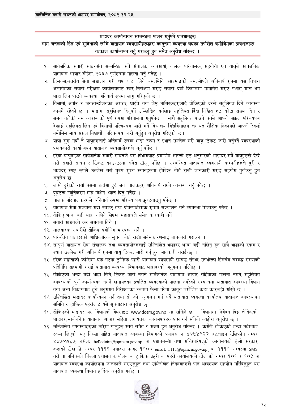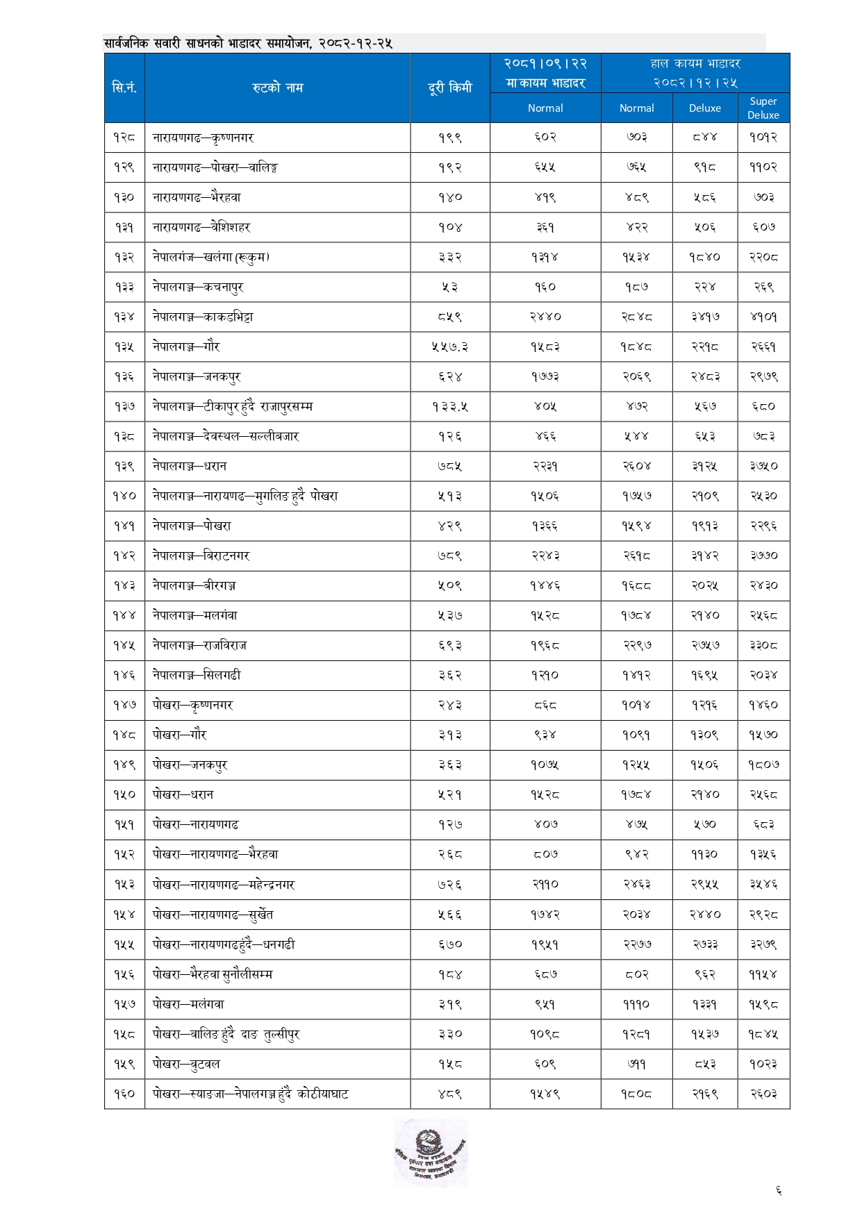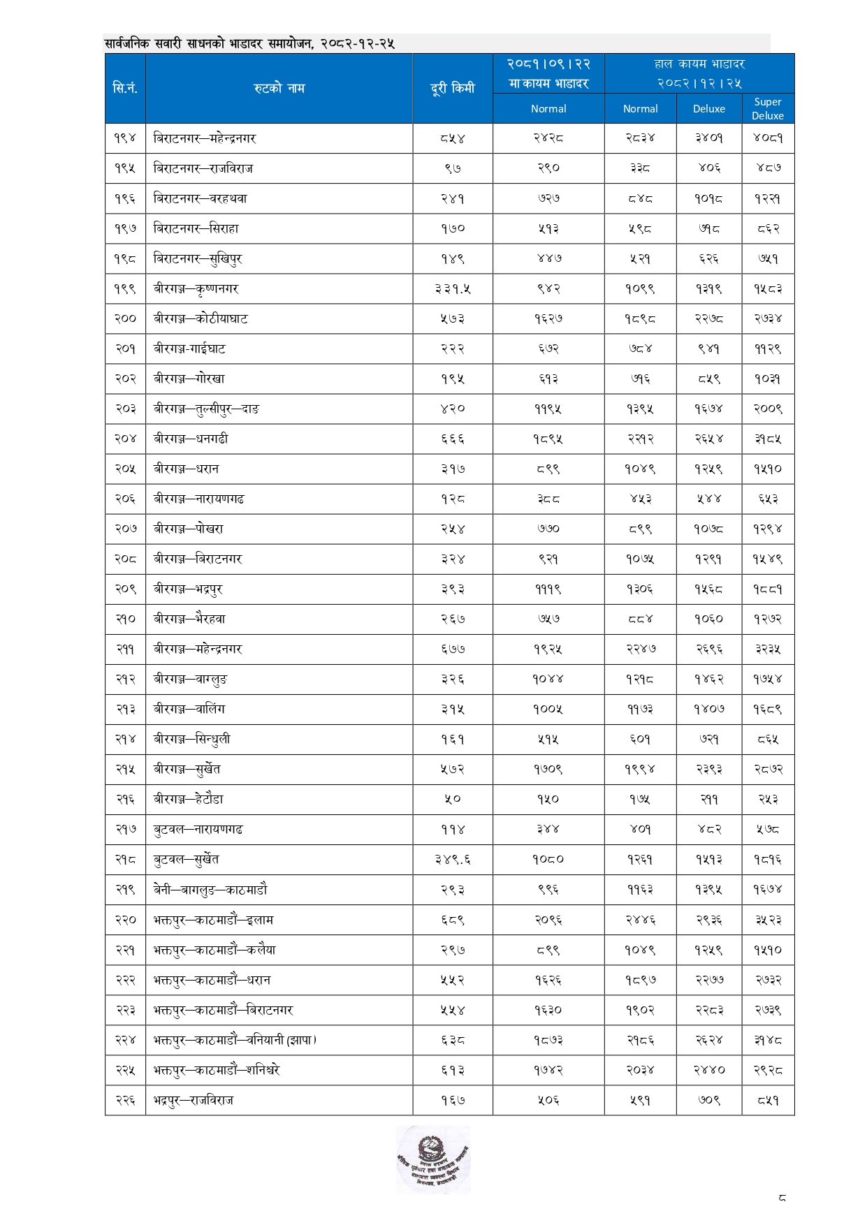 - भाडा वृद्धि डिजेलको मूल्यमा ५ रुपैयाँ थपघट भएको आधारमा गरिएको हो र नयाँ भाडा आजैबाट लागू भएको छ।