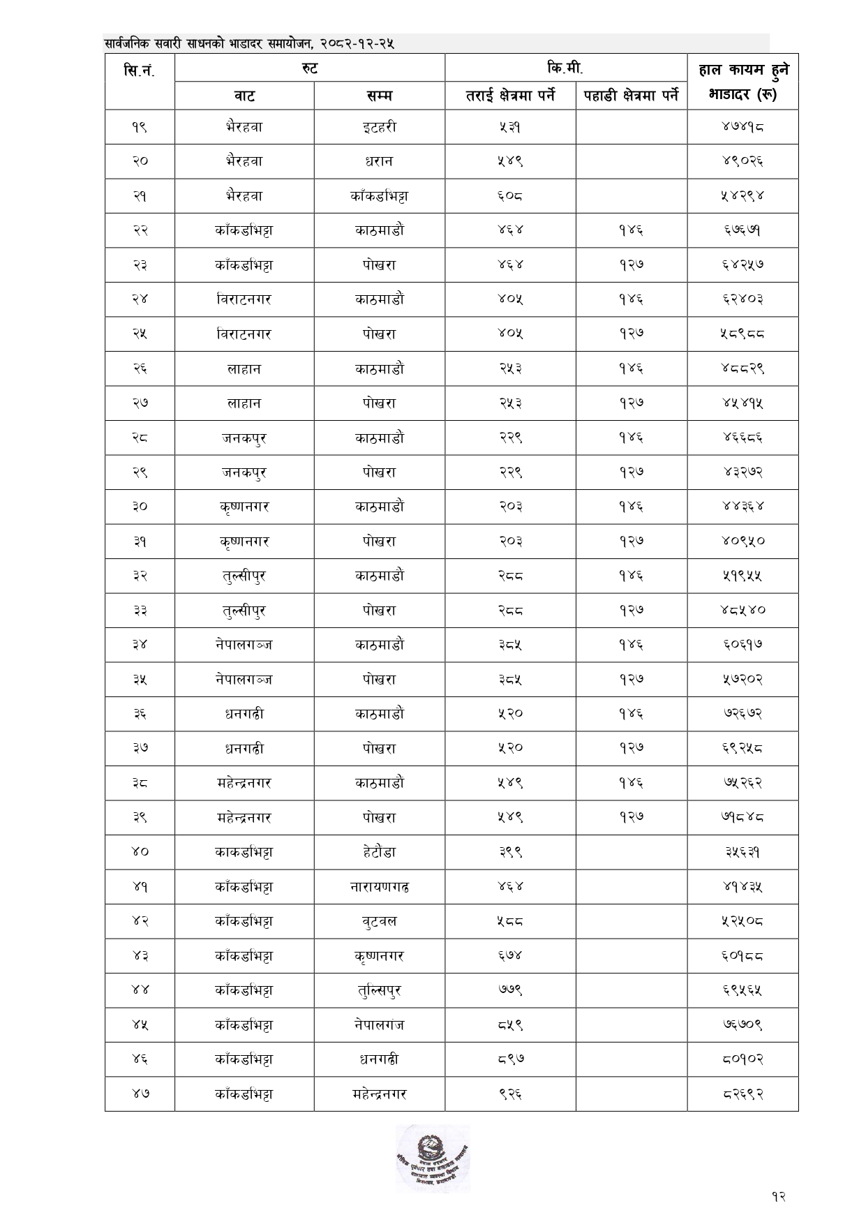 २५ चैत, काठमाडौं । सरकारले सार्वजनिक यातायातको भाडा वृद्धि गरेको छ । यातायात व्यवस्था विभागका अनुसार इन्धनको मूल्यमा ५ रुपैयाँ थपघट हुदाँ भाडा समायोजन गर्ने व्यवस्था अनुसार यो निर्णय गरिएको हो । बढेको भाडादर आजैबाट लागू भएको छ ।