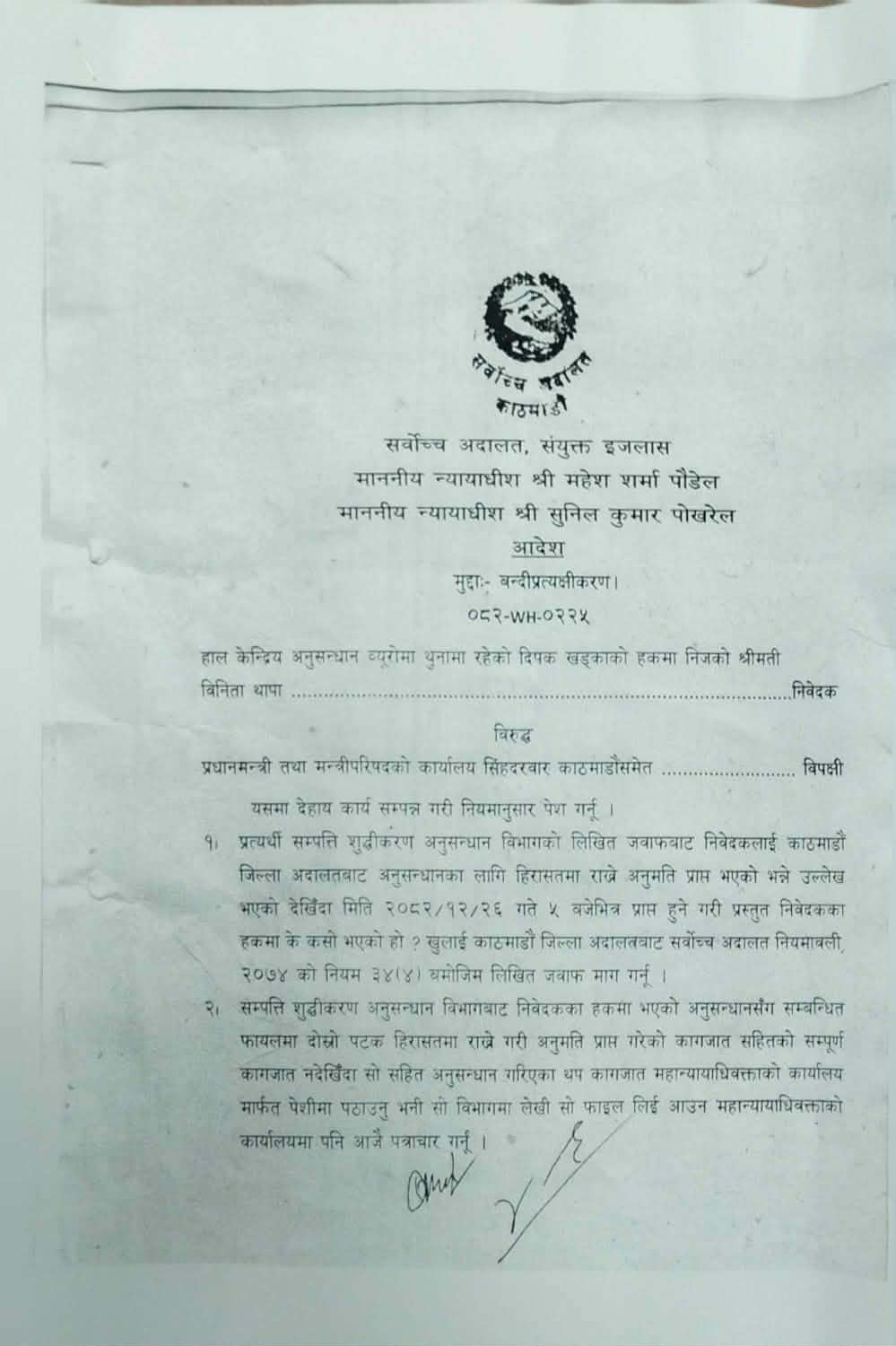 - सर्वोच्च अदालतले दिपक खड्काको पक्राउ विरुद्धको बन्दीप्रत्यक्षीकरण मुद्दामा अख्तियारबाट फाइल पेश गर्न आदेश दिएको छ।