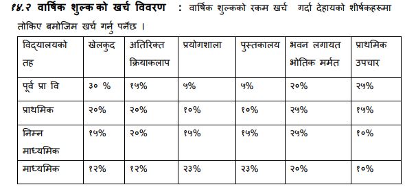 शुल्क निर्धारण मापदण्डमा १४ वटा शीर्षकमा शुल्क लिन पाइने व्यवस्था छ । मासिक पढाइ शुल्क, वर्षिक शुल्क, भर्ना शुल्क, धरौटी शुल्क, परीक्षा शुल्क, कम्प्युटर शुल्क, स्थानान्तरण शुल्क, विशेष प्रशिक्षण शुल्क, आवास शुल्क, भोजन शुल्क, परिवहन शुल्क, शैक्षिक भ्रमण, अन्तर विद्यालय प्रतियोगिता सञ्चालन र शैक्षिक सामग्री शुल्क लिन पाइने व्यवस्था छ ।