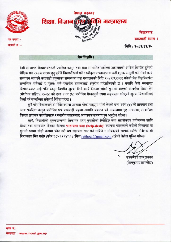 ‘शैक्षिक सत्र २०८३ प्रारम्भ हुनुपूर्व नै विद्यार्थी भर्ना गर्ने र भारी शुल्क असुली गर्ने गरेका सप्रमाण तथ्यहरू बाहिरिएका सम्बन्धमा यस मन्त्रालयको गम्भीर ध्यानकर्षण भएको छ,’ शिक्षा मन्त्रालयका प्रवक्ता शिवकुमार सापकोटाले जारी गरेको विज्ञप्तिमा भनिएको छ, ‘विद्यालय सञ्चालन जस्तो गरिमामय र जिम्मेवार प्रणालीमा यस्ता गैरकानुनी कार्यहरू अशोभनीय हुने मात्र नभई दण्डनीयसमेत हुनेतर्फ विद्यालयहरू स्वयं सजग हुनुपर्ने मानिन्छ ।’
