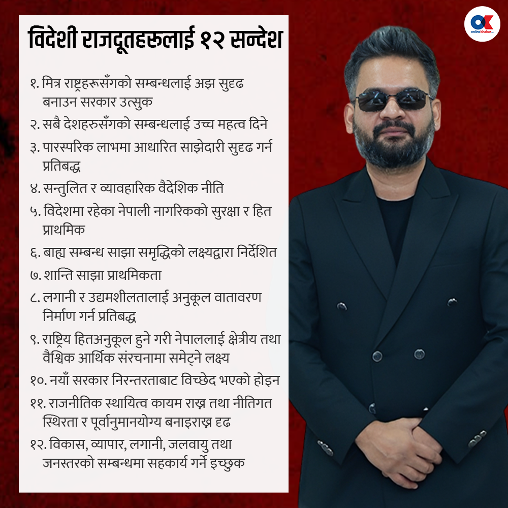 Generated by OK AI. Editorially reviewed.- प्रधानमन्त्री बालेन शाहले नेपालस्थित विदेशी राजदूत र कूटनीतिक नियोगका प्रमुखहरूलाई सरकारको प्राथमिकताबारे पहिलोपटक संयुक्त रूपमा ब्रिफिङ दिएका छन्।