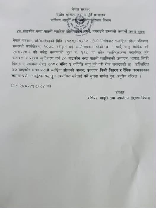Generated by OK AI. Editorially reviewed.- सरकारले ४० माइक्रोनभन्दा पातलो प्लास्टिक झोला उत्पादन, आयात, बिक्री वितरण र प्रयोगमा पूर्णरूपमा प्रतिबन्ध लगाएको छ।