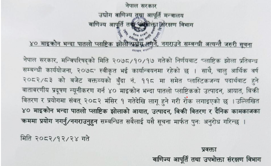 हिजो मंगलबार वाणिज्य आपूर्ति तथा उपभोक्ता संरक्षण विभागले पुन: प्लास्टिक प्रयोग नगर्न सूचना जारी गरेको छ । तर पूर्वतयारी, उद्योगहरूको यकिन तथ्यांक अभाव, सस्तो विकल्पको शून्यता र फितलो अनुगमन संयन्त्रले यो घोषणा पनि विगतका ९–१० वटा घोषणा जस्तै कागजमै सीमित हुने जोखिम बढेको छ ।