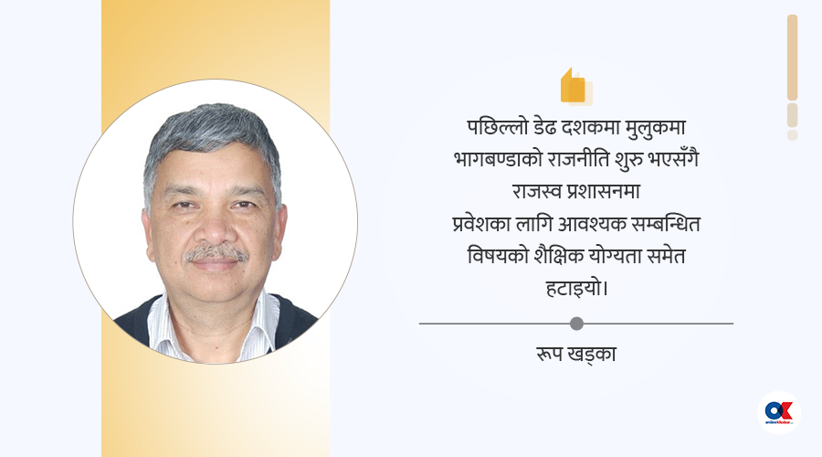 Generated by OK AI. Editorially reviewed.- पछिल्लो डेढ दशकमा नेपालमा राजस्व प्रशासनमा प्रवेशका लागि आवश्यक शैक्षिक योग्यता हटाइयो र राजनीतिक तथा व्यक्तिगत सम्बन्धमा आधारित नियुक्ति बढ्यो।