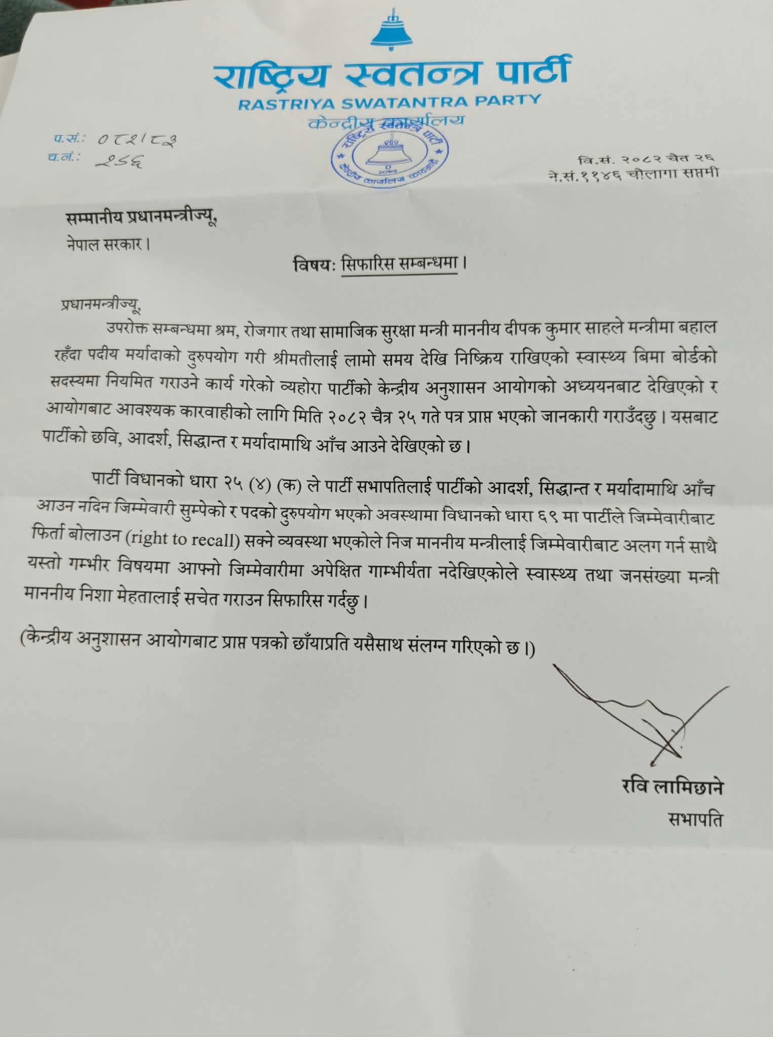 - सभापति रवि लामिछानेले साहलाई जिम्मेवारीबाट अलग गर्न र स्वास्थ्य मन्त्री निशा मेहतालाई सचेत गराउन सिफारिस पत्र लेखेका छन्।