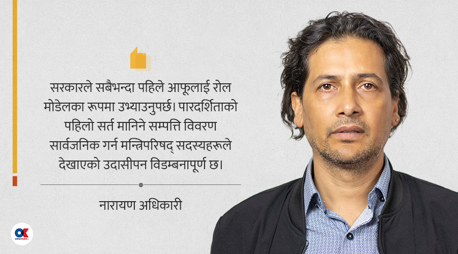 सरकारले सबैभन्दा पहिले आफूलाई रोल मोडेलका रूपमा उभ्याउनुपर्छ। पारदर्शिताको पहिलो सर्त मानिने सम्पत्ति विवरण सार्वजनिक गर्न मन्त्रिपरिषद् सदस्यहरूले देखाएको उदासीपन विडम्बनापूर्ण छ।