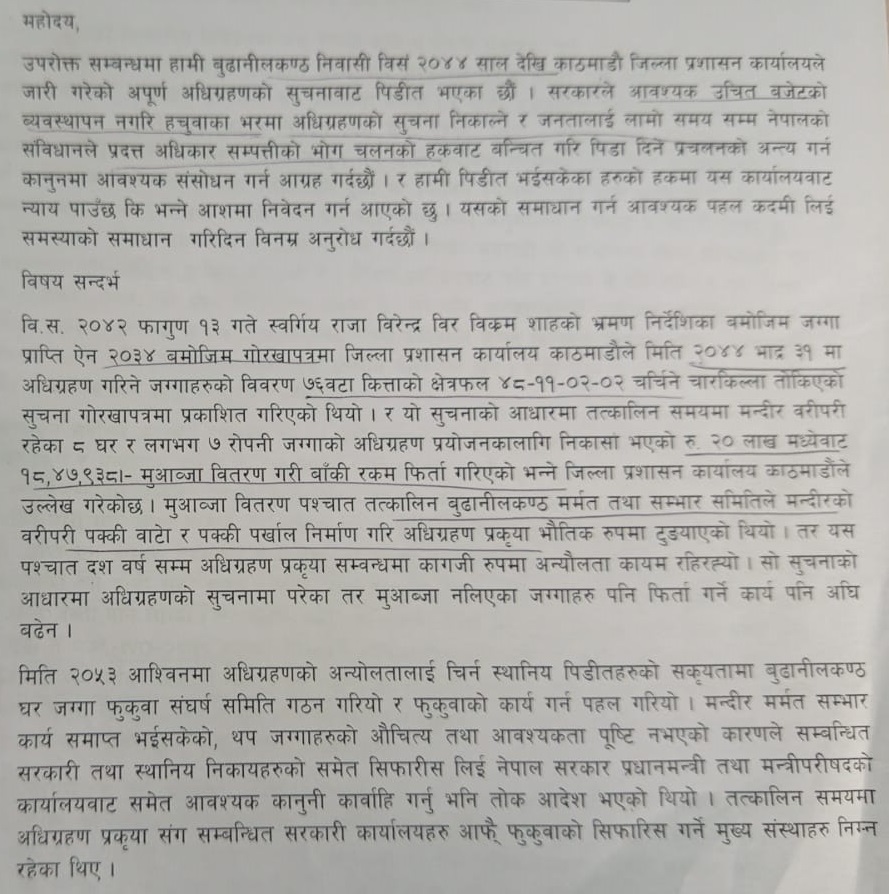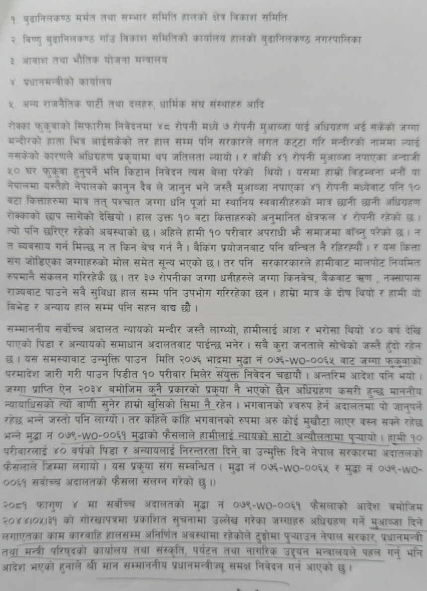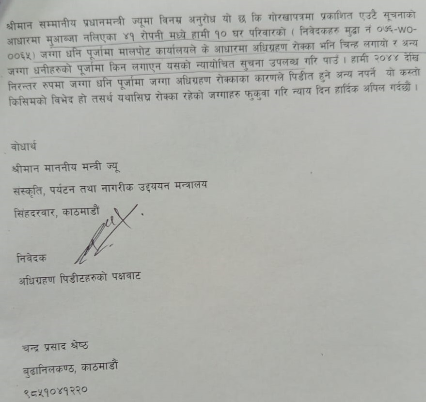 तर, पनि कुनै सुनुवाइ नभएपछि अहिले पीडितहरूले रोक्का फुकुवा वा उचित मुआब्जाको माग गर्दै प्रधानमन्त्रीसमक्ष हेलो सरकारमार्फत गुनासो टिपाएका हुन् ।