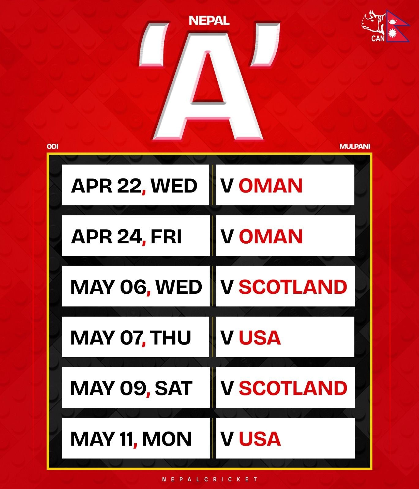 • नेपाल ‘ए’ ले अप्रिल २२ र २४ मा ओमानसँग, मे ६ र ९ मा स्कटल्यान्डसँग, मे ७ र ११ मा अमेरिकासँग खेल्नेछ।