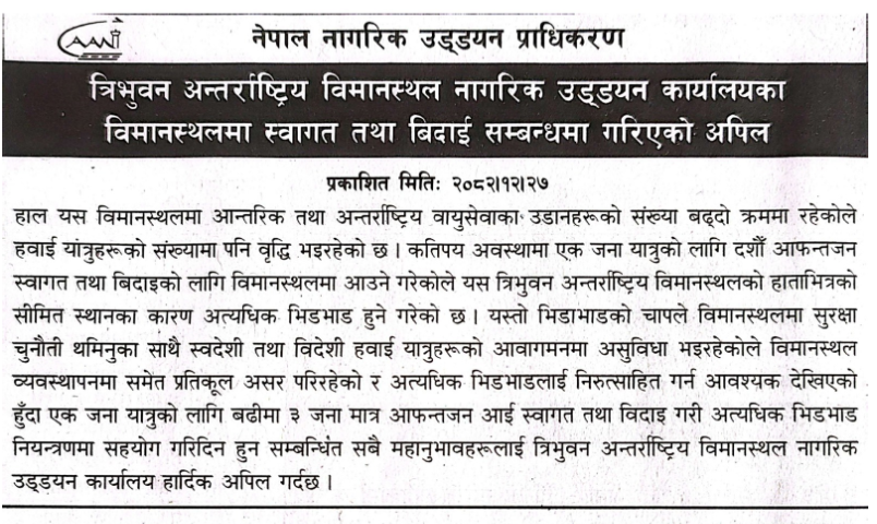 - प्रशासनले अनावश्यक भीडले स्वदेशी तथा विदेशी यात्रुको आवागमनमा असुविधा भएको बताउँदै कम आफन्त आएर सहयोग गर्न अनुरोध गरेको छ।
