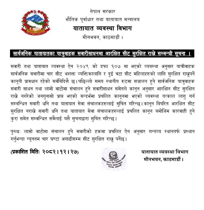 यातायात व्यवस्था विभागले शुक्रबार सूचना जारी गर्दै यस्तो चेतावनी दिएको हो । यात्रुवाहक सवारीसाधनमा चार सिट अशक्त व्यक्तिका लागि र दुई सिट महिलाका लागि आरक्षित गरिएको छ ।