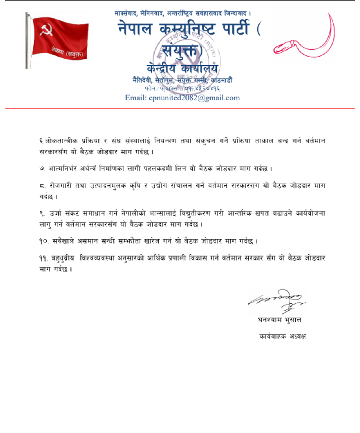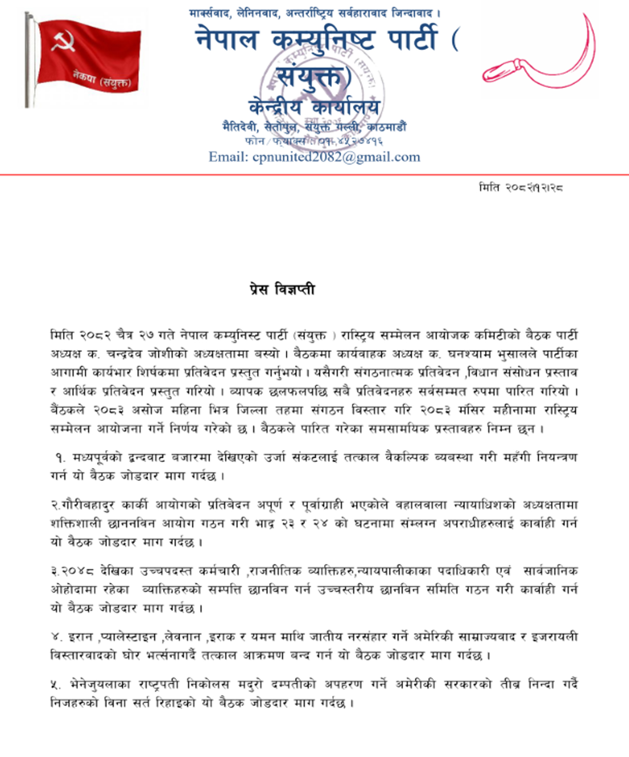 सो पार्टीका कार्यवाहक अध्यक्ष घनश्याम भुसालद्वारा जारी विज्ञप्तिमा विभिन्न राष्ट्रिय तथा अन्तर्राष्ट्रिय विषयसहित ११ बुँदे निर्णय भएको उल्लेख छ ।