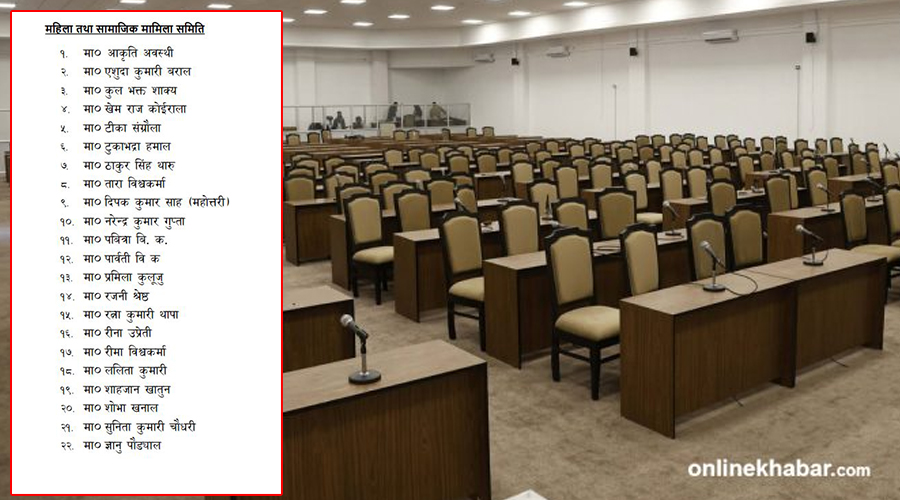 संसदीय विषयगत समिति गत शुक्रबार गठन भएको थियो । जसअनुसार महिला तथा सामाजिक मामिला समिति २२ सदस्यीय छ ।